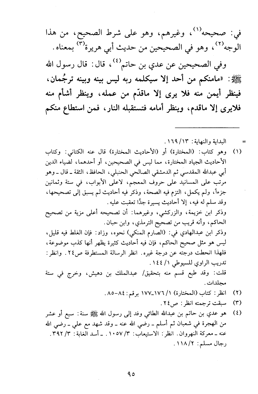 في صحيحه وغيرهم وهو على شرط الصحيح من هذا الوجه وهو في الصحيحين من حديث أبي هريرة بمعناه وفي الصحيحين عن عدي بن حاتم قال قال رسول الله صلى الله عليه وسلم ما منكن من احد إلا سيكلمه ربه ليس بينه وبينه تُرجمان فينظر أيمن منه فلا يرى إلا ما قدّم من عمله وينظر أشأم منه فلا يرى إلا ما قدم وينظر أمامه فتستقبله النار فمن استطاع منكم