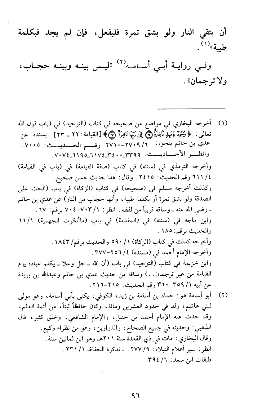 أن يتقي النار ولو بشق تمرة فليفعل فإن لم يجد فبكلمة طيبة وفي رواية أبي أسامة ليس بينه وبينه حجاب ولا ترجمان
