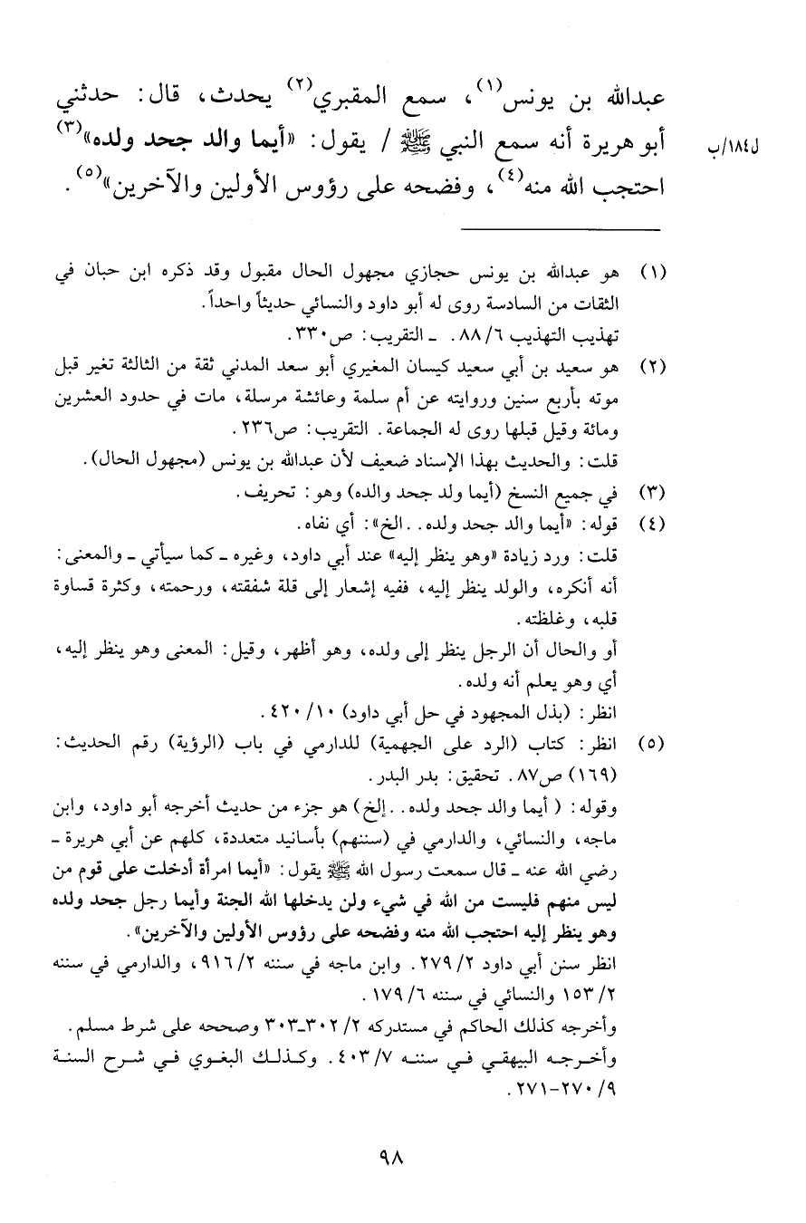 عبد الله بن يونس سمع المقبري يحدث قال حدثني أبو هريرة أنه سمع النبي صلى الله عليه وسلم يقول أيما والد جحد ولده احتجب الله منه وفضحه على رؤوس الأولين والآخرين