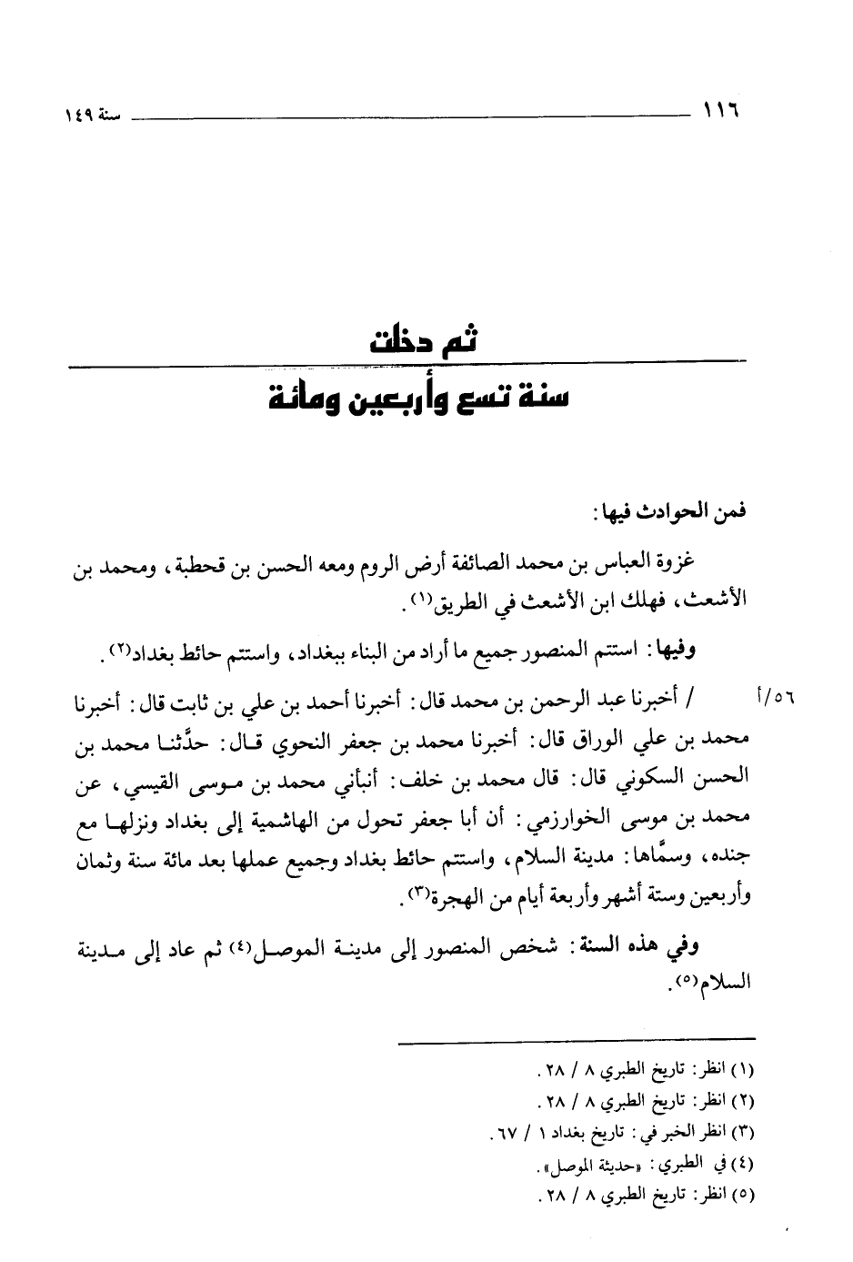 / أخبرنا عبد الرحمن بن محمد قال: أخبرنا أحمد بن علي بن ثابت قال: أَخْبَرَنَا مُحَمَّد بْن عَلِيّ الوراق قَالَ: أَخْبَرَنَا مُحَمَّد بْن جَعْفَر النحوي قَالَ: حَدَّثَنَا مُحَمَّد بْن الْحَسَن السكوني قَالَ: قَالَ مُحَمَّد بْن خلف: أنبأني مُحَمَّد بْن موسى القيسي، عَنْ مُحَمَّد بْن موسى الخوارزمي: أن أبا جَعْفَر تحول من الهاشمية إِلَى بغداد ونزلها مَعَ جنده، وسماها: مدينة السلام، واستتم حائط بغداد وجميع عملها بعد مائة سنة وثمان وأربعين وستة أشهر وأربعة أيام من الهجرة [3] .
