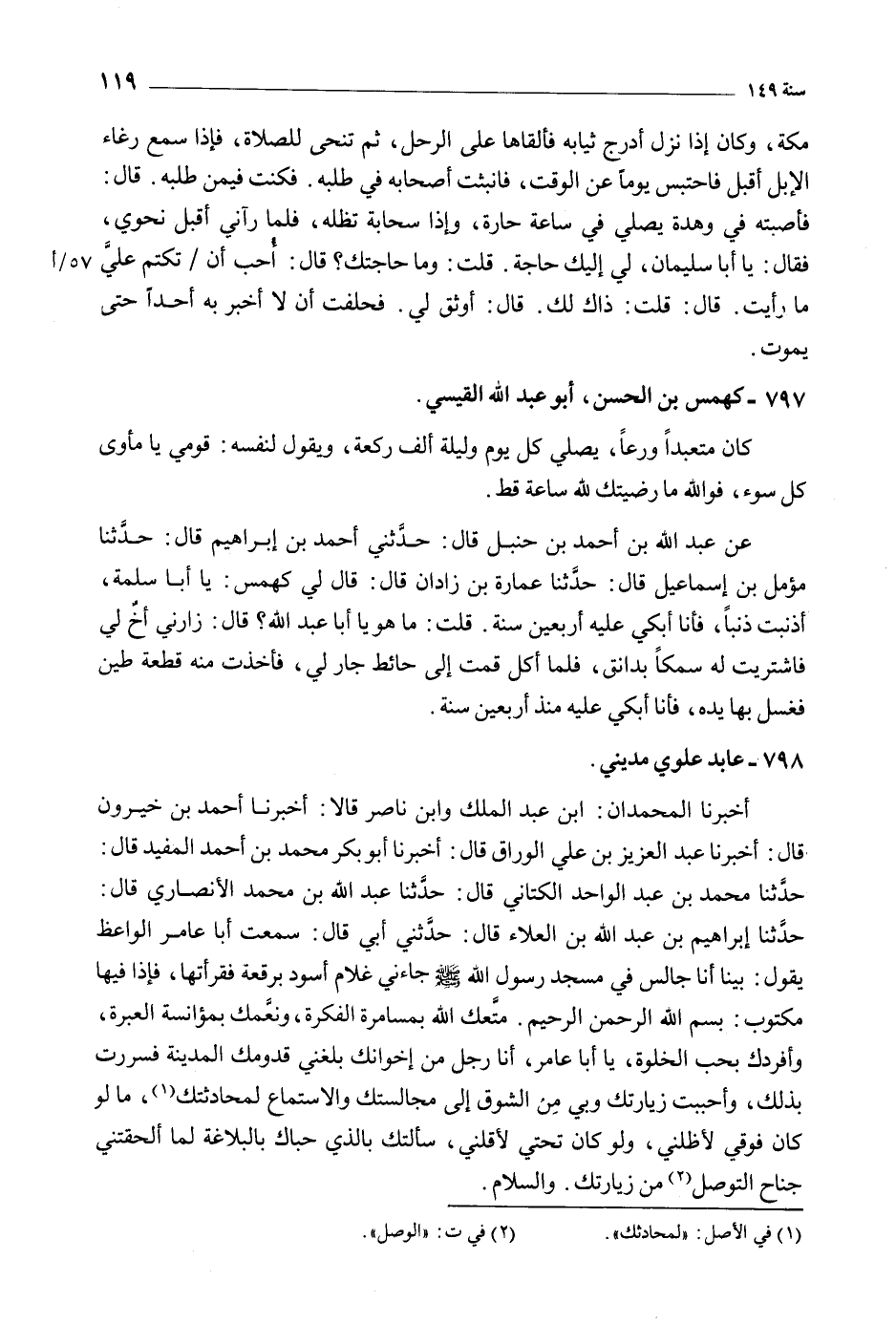 عَنْ عَبْد اللَّهِ بْنُ أَحْمَد بْنِ حَنْبَلٍ قَالَ: حدثني أَحْمَد بْن إِبْرَاهِيم قَالَ: حَدَّثَنَا مؤمل بْن إِسْمَاعِيل قَالَ: حَدَّثَنَا عمارة بْن زادان قَالَ: قَالَ لي كهمس: يا أبا سلمة، أذنبت ذنبا، فأنا أبكي عليه أربعين سنة. قلت: مَا هو يا أبا عَبْد اللَّه؟ قَالَ: زارني أخ لي فاشتريت لَهُ سمكا بدانق، فلما أكل قمت إِلَى حائط جار لي، فأخذت منه قطعة طين فغسل بها يده، فأنا أبكي عليه منذ أربعين سنة.