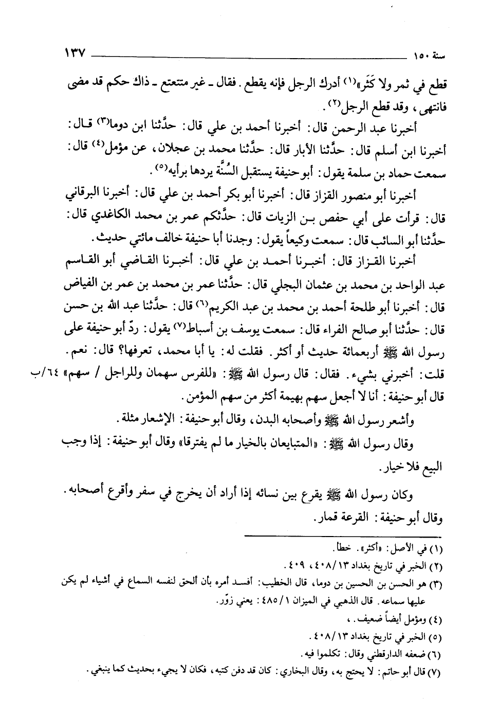 أَخْبَرَنَا الْقَزَّازُ قَالَ: أَخْبَرَنَا أَحْمَدُ بْنُ عَلِيٍّ قَالَ: أَخْبَرَنَا الْقَاضِي أَبُو الْقَاسِمِ عَبْدُ الْوَاحِدِ بْنُ مُحَمَّدِ بْنِ عُثْمَانَ الْبَجْلِيُّ قَالَ: حَدَّثَنَا عُمَرُ بْنُ مُحَمَّدِ بْنِ عُمَرَ بْنِ الفياض قال: أخبرنا أبو طلحة أَحْمَدَ بْنُ مُحَمَّد بْنِ عَبْدِ الْكَرِيمِ [6] قَالَ: حَدَّثَنَا عَبْدُ اللَّهُ بْنُ حَسَنٍ قَالَ: حَدَّثَنَا أَبُو صَالِحٍ الْفَرَّاءُ قَالَ: سَمِعْتُ يُوسُفَ بْنَ أَسْبَاطٍ [7] يَقُولُ: رَدَّ أَبُو حُنِيفَةَ عَلَى رَسُولِ الله صلى الله عليه وسلم أربعمائة حَدِيثٍ أَوْ أَكْثَرَ. فَقُلْتُ لَهُ: يَا أَبَا مُحَمَّدٍ، تَعْرِفُهَا؟ قَالَ: نَعَمْ.