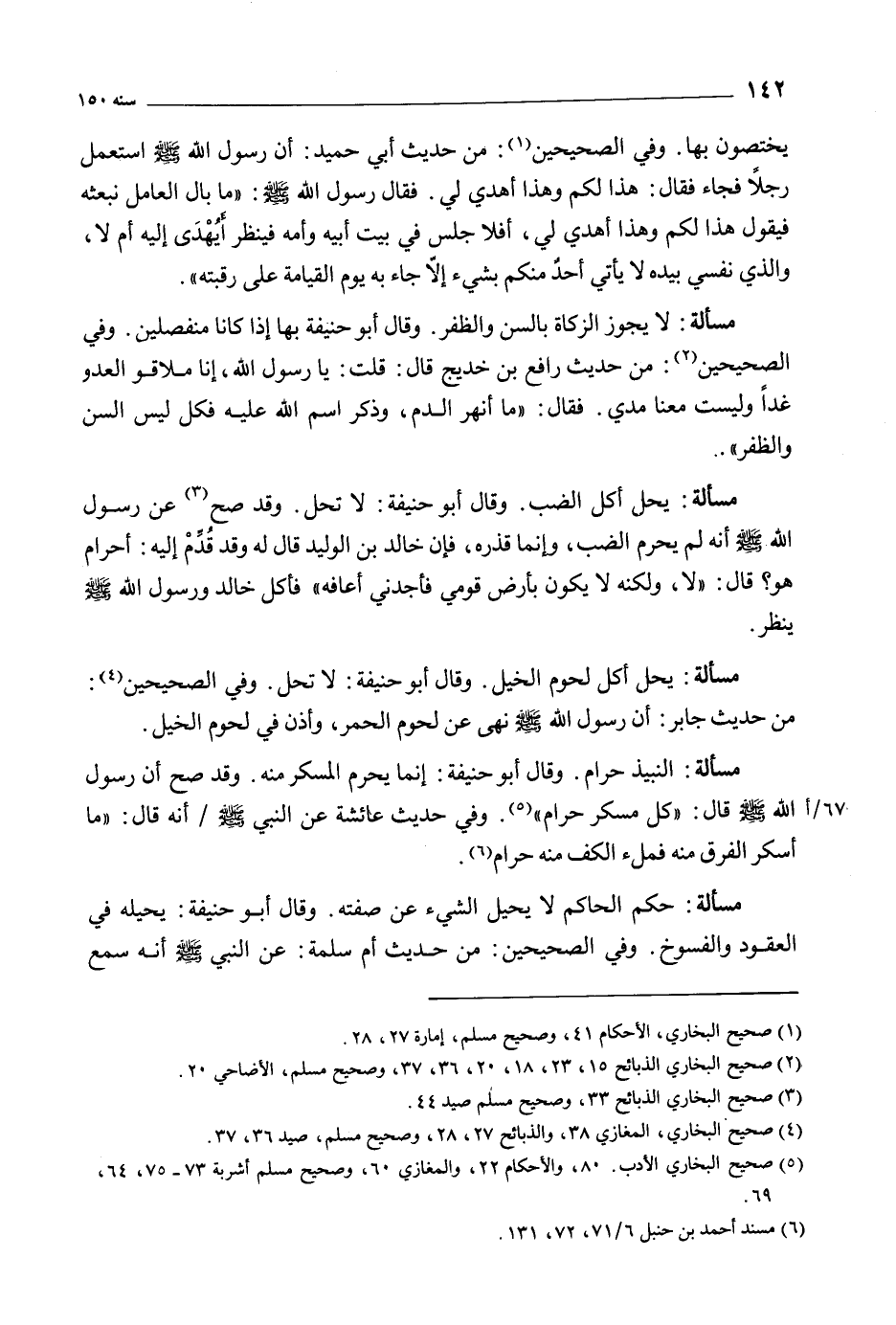 يختصون بها. وفي الصحيحين [1] : من حديث أبي حميد: أن رسول الله صلى الله عليه وسلم استعمل رجلا فجاء فَقَالَ: هَذَا لكم وهذا أهدي لي. فَقَالَ رسول الله صَلَّى اللَّهُ عَلَيْهِ وَسَلَّمَ: «مَا بال العامل نبعثه فيقول هذا لكم وهذا أهدي لي، أفلا جلس فِي بيت أبيه وأمه فينظر أيهدى إِلَيْهِ أم لا، والذي نفسي بيده لا يأتي أحد منكم بشيء إلا جاء به يوم القيامة عَلَى رقبته» . مسألة: لا يجوز الزكاة بالسن والظفر. وَقَالَ أَبُو حَنِيفَةَ بها إذا كانا منفصلين. وفي الصحيحين [2] : من حديث رَافِع بْن خديج قال: قلت: يا رسول الله، إنا ملاقو العدو غدا وليست معنا مدي. فَقَالَ: «مَا أنهر الدم، وذكر اسم اللَّه عليه فكل ليس السن والظفر» . مسألة: يحل أكل الضب. وَقَالَ أَبُو حَنِيفَةَ: لا تحل. وقد صح [3] عَنْ رسول الله صَلَّى اللَّهُ عَلَيْهِ وَسَلَّمَ أنه لم يحرم الضب، وإنما قذره، فإن خالد بْن الوليد قَالَ لَهُ وقد قدم إِلَيْهِ: أحرام هو؟ قَالَ: «لا، ولكنه لا يكون بأرض قومي فأجدني أعافه» فأكل خالد ورسول الله صَلَّى اللَّهُ عَلَيْهِ وَسَلَّمَ ينظر. مسألة: يحل أكل لحوم الخيل. وَقَالَ أَبُو حَنِيفَةَ: لا تحل. وفي الصحيحين [4] :