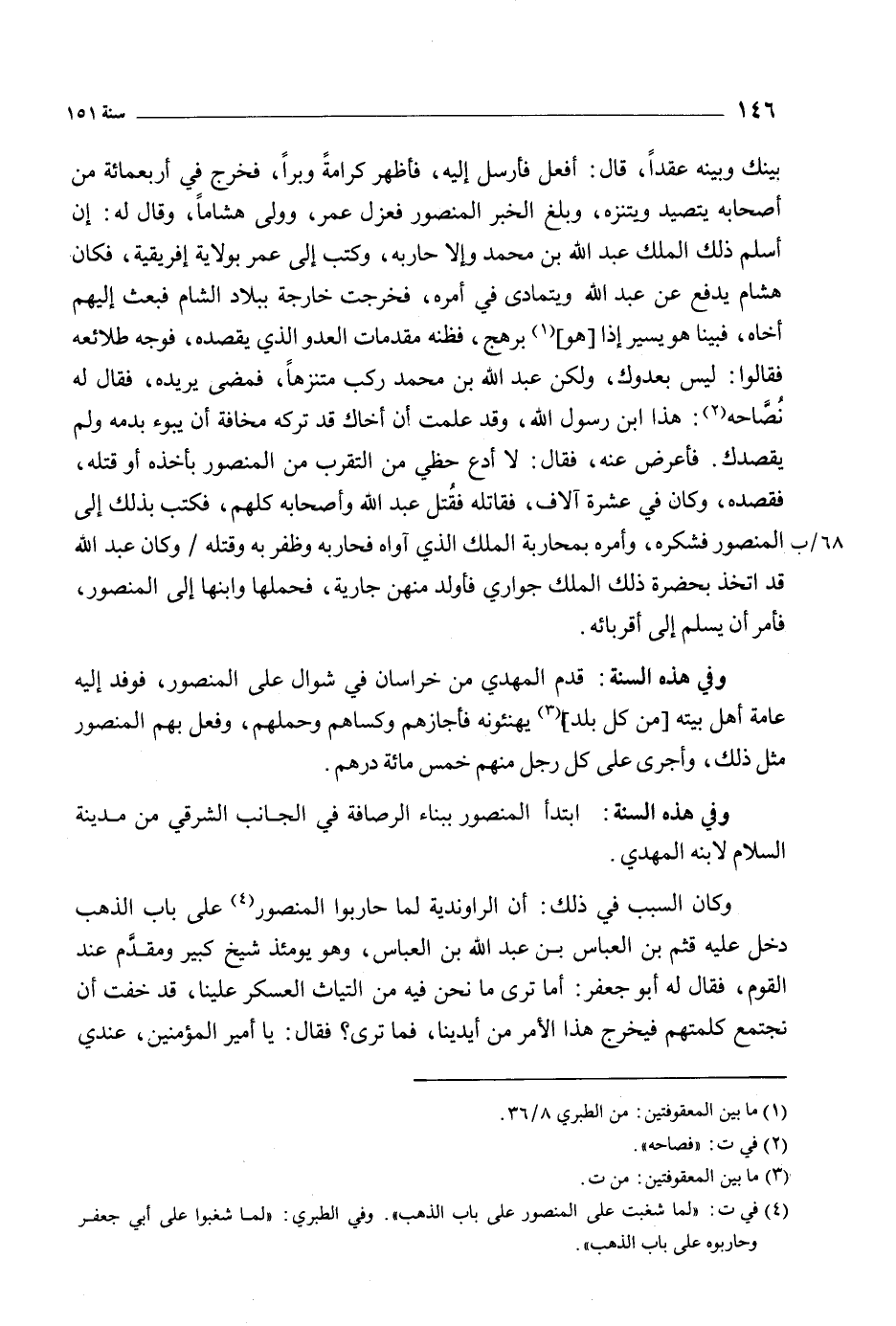 بينك وبينه عقدا، قَالَ: أفعل فأرسل إِلَيْهِ، فأظهر كرامة وبرا، فخرج في أربعمائة من أصحابه يتصيد ويتنزه، وبلغ الخبر المنصور فعزل عُمَر، وولى هشاما، وَقَالَ لَهُ: إن أسلم ذلك الملك عَبْد اللَّه بْن مُحَمَّد وإلا حاربه، وكتب إِلَى عُمَر بولاية إفريقية، فكان هِشَام يدفع عَنْ عَبْد اللَّه ويتمادى فِي أمره، فخرجت خارجة ببلاد الشام فبعث إليهم أخاه، فبينا هو يسير إذا [هو] [1] برهج، فظنه مقدمات العدو الَّذِي يقصده، فوجه طلائعه فقالوا: ليس بعدوك، ولكن عَبْد اللَّه بْن مُحَمَّد ركب متنزها، فمضى يريده، فَقَالَ لَهُ نصاحه [2] : هَذَا ابْن رسول الله، وقد علمت أن أخاك قَدْ تركه مخافة أن يبوء بدمه ولم يقصدك. فأعرض عنه، فَقَالَ: لا أدع حظي من التقرب من المنصور بأخذه أو قتله، فقصده، وَكَانَ فِي عشرة آلاف، فقاتله فقتل عَبْد اللَّه وأصحابه كلهم، فكتب بذلك إلى 68/ ب المنصور فشكره، وأمره بمحاربة الملك الَّذِي آواه فحاربه وظفر به وقتله/ وَكَانَ عَبْد اللَّه قَدِ اتخذ بحضرة ذلك الملك جواري فأولد منهن جارية، فحملها وابْنها إِلَى المنصور، فأمر أن يسلم إِلَى أقربائه.