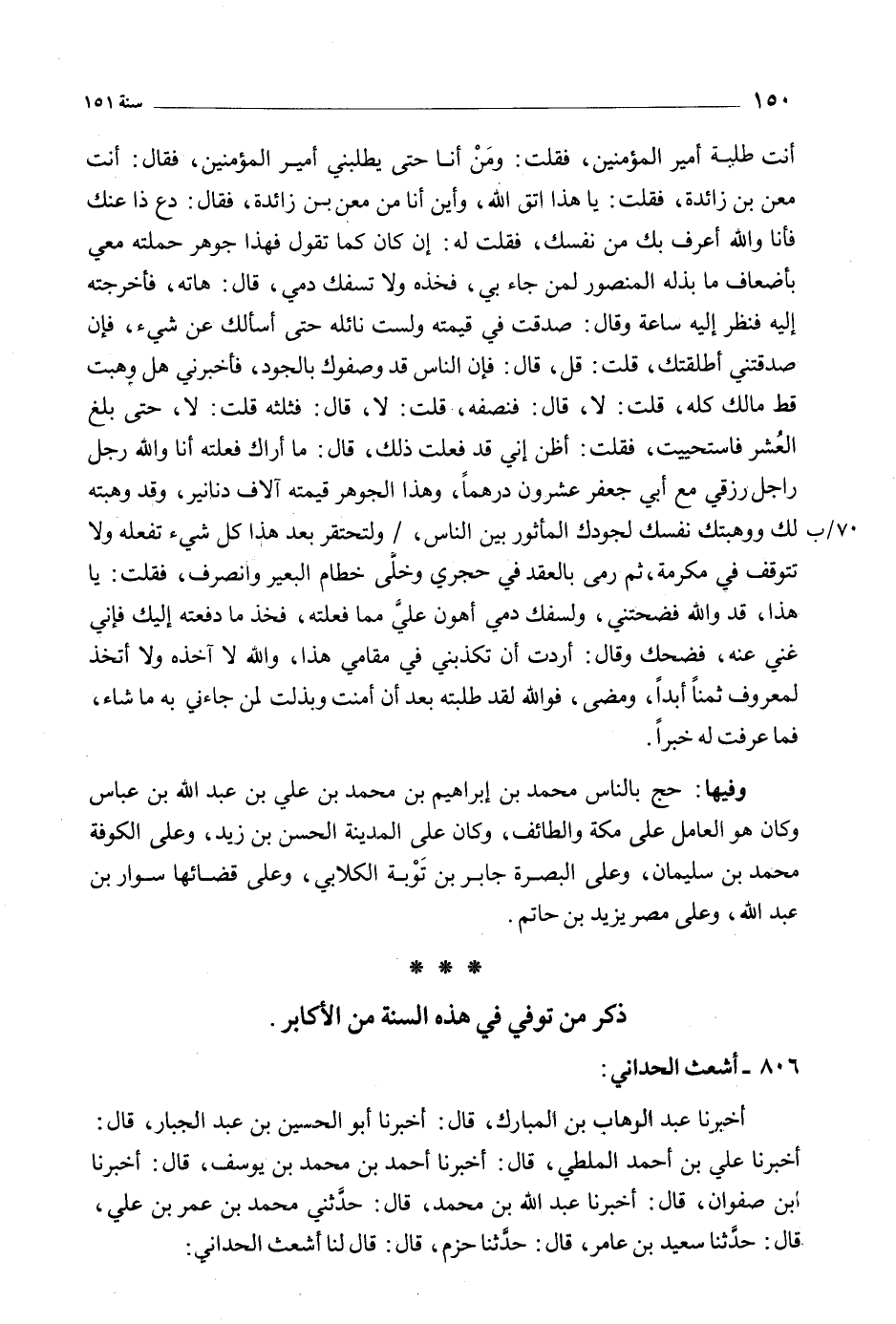 أنت طلبة أمير المؤمنين، فقلت: ومن أنا حَتَّى يطلبْني أمير المؤمنين، فَقَالَ: أنت معن بْن زائدة، فقلت: يا هَذَا اتق اللَّه، وأين أنا من معن بْن زائدة، فَقَالَ: دع ذا عنك فأنا واللَّهِ أعرف بك من نفسك، فقلت لَهُ: إن كَانَ كما تقول فهذا جوهر حملته معي بأضعاف مَا بذله المنصور لمن جاء بي، فخذه ولا تسفك دمي، قَالَ: هاته، فأخرجته إِلَيْهِ فنظر إِلَيْهِ ساعة وَقَالَ: صدقت فِي قيمته ولست نائله حَتَّى أسألك عَنْ شيء، فإن صدقتني أطلقتك، قلت: قل، قَالَ: فإن الناس قَدْ وصفوك بالجود، فأخبرني هل وهبت قط مالك كله، قلت: لا، قَالَ: فنصفه، قلت: لا، قَالَ: فثلثه قلت: لا، حَتَّى بلغ العشر فاستحييت، فقلت: أظن إني قَدْ فعلت ذلك، قال: ما أراك فعلته أنا والله رجل راجل رزقي مَعَ أبي جَعْفَر عشرون درهما، وهذا الجوهر قيمته آلاف دنانير، وقد وهبته 70/ ب لك ووهبتك نفسك لجودك المأثور بين الناس، / ولتحتقر بعد هَذَا كل شيء تفعله ولا تتوقف فِي مكرمة، ثُمَّ رمى بالعقد فِي حجري وخلى خطام البعير وانصرف، فقلت: يا هذا، قد والله فضحتني، ولسفك دمي أهون علي مما فعلته، فخذ مَا دفعته إليك فإني غني عنه، فضحك وَقَالَ: أردت أن تكذبْني فِي مقامي هَذَا، والله لا آخذه ولا أتخذ لمعروف ثمنا أبدا، ومضى، فو الله لقد طلبته بعد أن أمنت وبذلت لمن جاءني به مَا شاء، فما عرفت لَهُ خبرا.