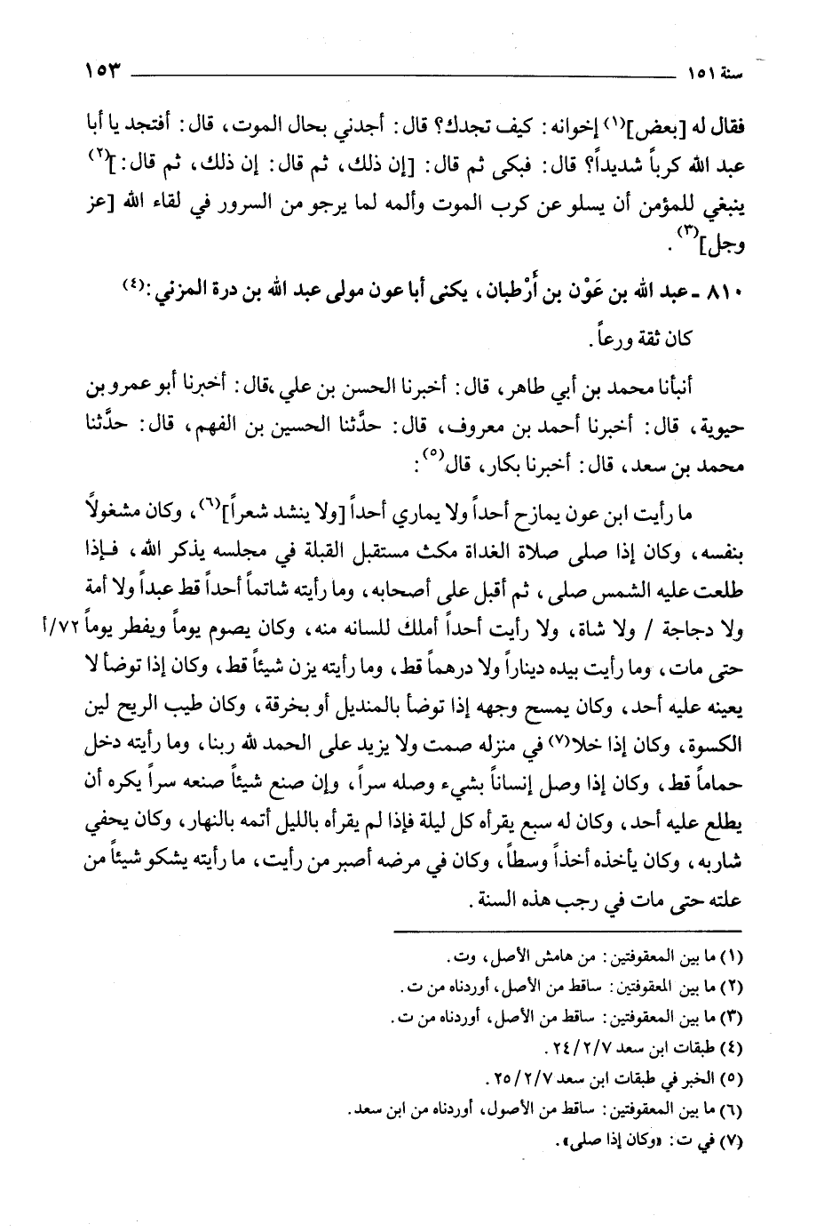 مَا رأيت ابْن عون يمازح أحدا ولا يماري أحدا [ولا ينشد شعرا] [6] ، وَكَانَ مشغولا بنفسه، وكان إذا صلى صلاة الغداة مكث مستقبل القبلة فِي مجلسه يذكر اللَّه، فإذا طلعت عليه الشمس صلى، ثُمَّ أقبل عَلَى أصحابه، وما رأيته شاتما أحدا قط عبدا ولا أمة ولا دجاجة/ ولا شاه، ولا رأيت أحدا أملك للسانه منه، وَكَانَ يصوم يوما ويفطر يوما 72/ أحتى مات، وما رأيت بيده دينارا ولا درهما قط، وما رأيته يزن شيئا قط، وَكَانَ إذا توضأ لا يعينه عليه أحد، وكان يمسح وجهه إذا توضأ بالمنديل أو بخرقة، وَكَانَ طيب الريح لين الكسوة، وَكَانَ إذا خلا [7] فِي منزله صمت ولا يزيد عَلَى الحمد للَّه ربْنا، وما رأيته دخل حماما قط، وَكَانَ إذا وصل إنسانا بشيء وصله سرا، وإن صنع شيئا صنعه سرا يكره أن يطلع عليه أحد، وَكَانَ لَهُ سبع يقرأه كل ليلة فإذا لم يقرأه بالليل أتمه بالنهار، وَكَانَ يحفي شاربه، وَكَانَ يأخذه أخذا وسطا، وَكَانَ فِي مرضه أصبر من رأيت، مَا رأيته يشكو شيئا من علته حَتَّى مات في رجب هذه السنة.