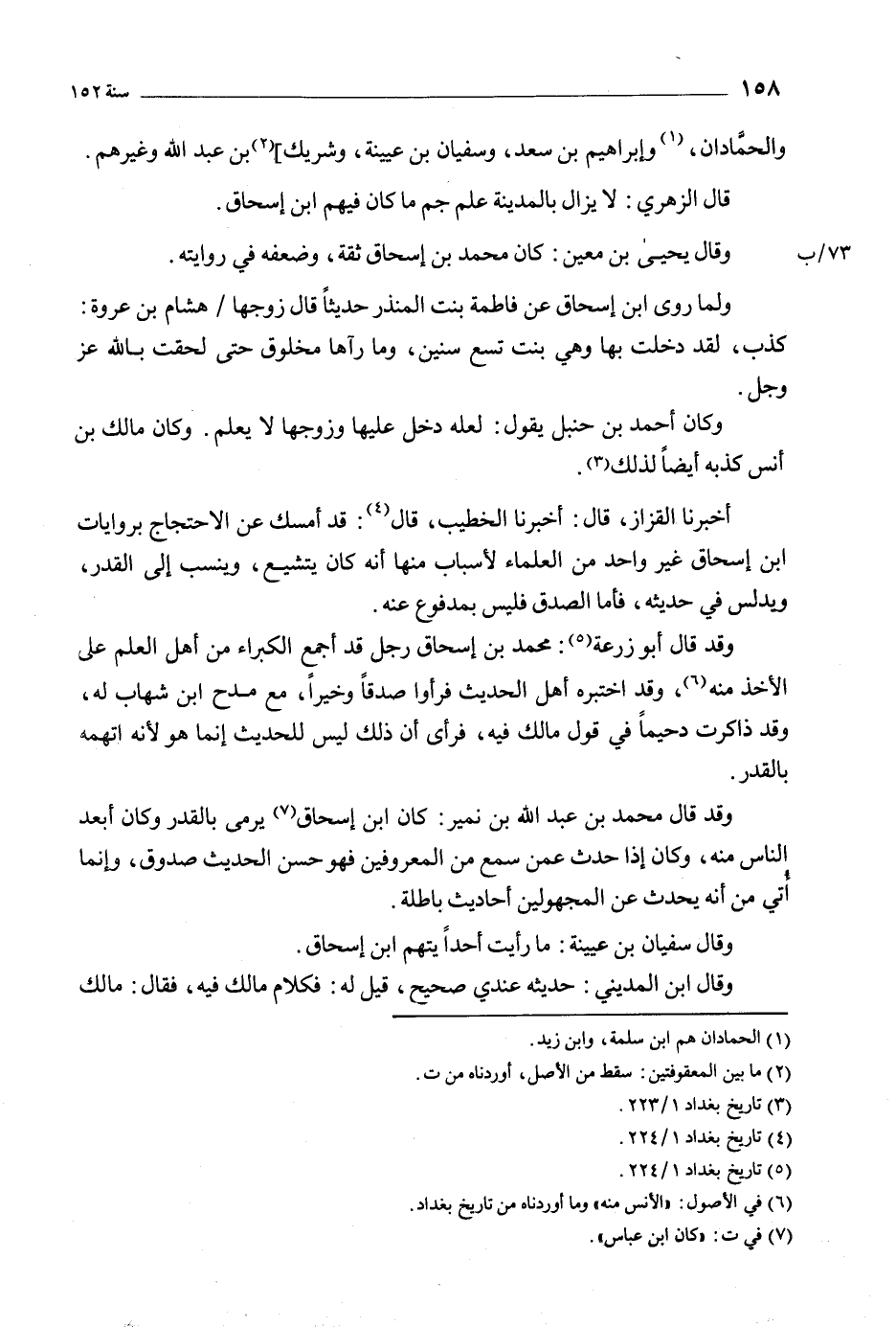 أَخْبَرَنَا القزاز، قَالَ: أَخْبَرَنَا الخطيب، قَالَ [4] : قَدْ أمسك عَنِ الاحتجاج بروايات ابْن إِسْحَاق غير واحد من العلماء لأسباب منها أنه كَانَ يتشيع، وينسب إِلَى القدر، ويدلس في حديثه، فأما الصدق فليس بمدفوع عنه.