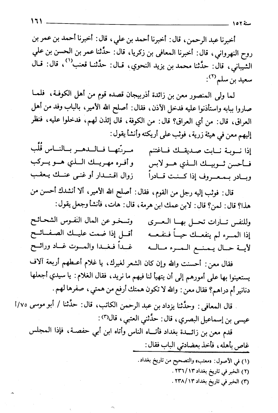 فَقَالَ معن: أحسنت والله وإن كَانَ الشعر لغيرك، يا غلام أعطهم أربعة آلاف يستعينوا بها عَلَى أمورهم إِلَى أن يتهيأ لنا فيهم مَا نريد، فَقَالَ الغلام: يا سيدي أجعلها دنانير أم دراهم؟ فَقَالَ معن: والله لا تكون همتك أرفع من همتي، صفرها لهم قَالَ المعافى: وحدثنا يزداد بْن عَبْد الرَّحْمَنِ الكاتب، قَالَ: حَدَّثَنَا/ أَبُو موسى 75/ أعيسى بْن إِسْمَاعِيل الْبَصْرِيّ، قَالَ: حَدَّثَنِي العتبي، قَالَ [3] :