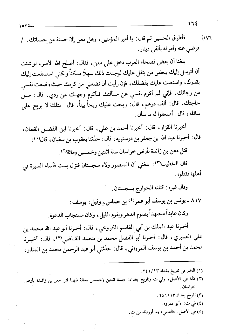 [2] كذا في الأصل، وفي ت وتاريخ بغداد: «سنة اثنتين وخمسين ومائة فيها قتل معن بن زائدة بأرض خراسان.