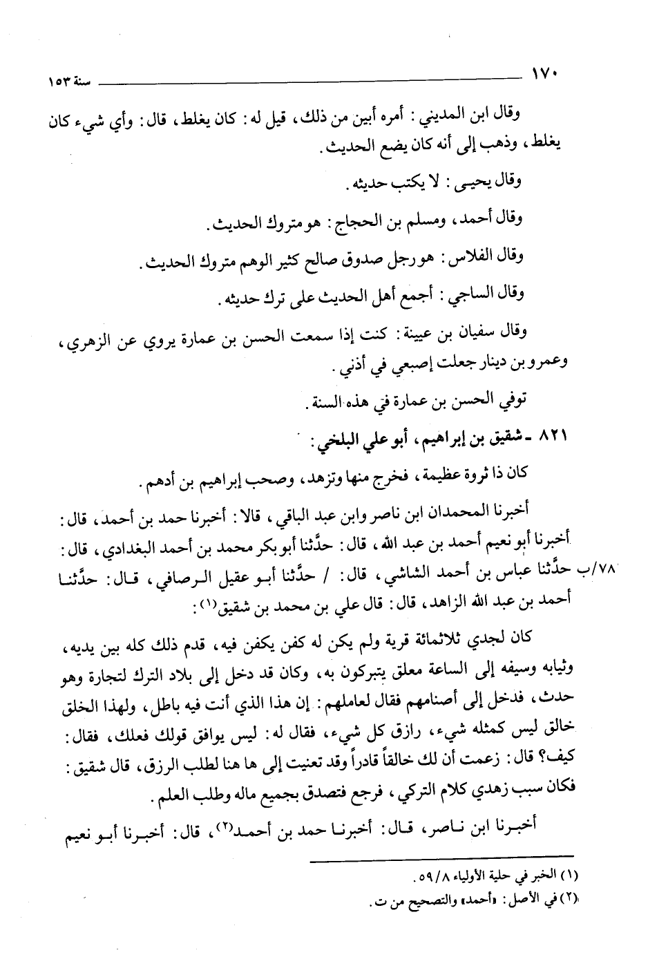 78/ ب حَدَّثَنَا عباس بْن أَحْمَد الشاشي، قَالَ: / حَدَّثَنَا أَبُو عقيل الرصافي، قَالَ: حَدَّثَنَا أَحْمَد بْن عَبْد اللَّه الزاهد، قَالَ: قَالَ عَلِيّ بْن محمد بن شقيق [1] :