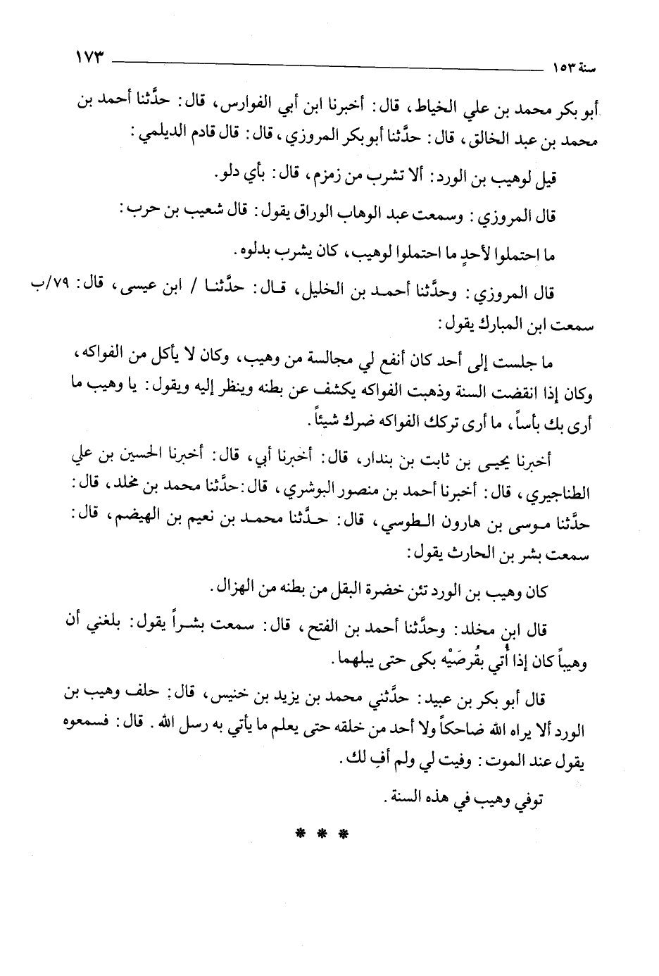 قَالَ أَبُو بكر بْن عبيد: حَدَّثَنِي مُحَمَّد بْن يزيد بْن خنيس، قَالَ: حلف وهيب بْن الورد ألا يراه الله ضاحكا ولا أحد من خلقه حَتَّى يعلم مَا يأتي به رسل اللَّه. قَالَ: فسمعوه يَقُول عند الموت: وفيت لي ولم أف لك.