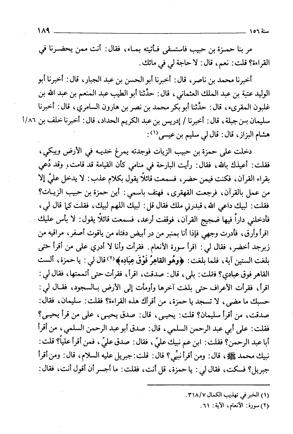 فقلت: لبيك داعي اللَّه، فبدرني ملك فَقَالَ قل: لبيك اللَّهمّ لبيك، فقلت كما قَالَ لي، فأدخلني دارا فِيهَا ضجيج القرآن، فوقفت أرعد، فسمعت قائلا يَقُول: لا بأس عَلَيْك اقرأ وأرق، فأدرت وجهي فإذا أنا بمنبر من در أبيض دفتاه من ياقوت أصفر، مراقيه من زبرجد أخضر، فقال لي: اقرأ سورة الأنعام. فقرأت وأنا لا أدري عَلَى من أقرأ حتى بلغت الستين آية، فلما بلغت: وَهُوَ الْقاهِرُ فَوْقَ عِبادِهِ 6: 18 [2] قَالَ لي: يا حمزة، ألست القاهر فوق عبادي؟ فقلت: بلى، قَالَ: صدقت، اقرأ، فقرأت حَتَّى أتممتها، فَقَالَ لي: