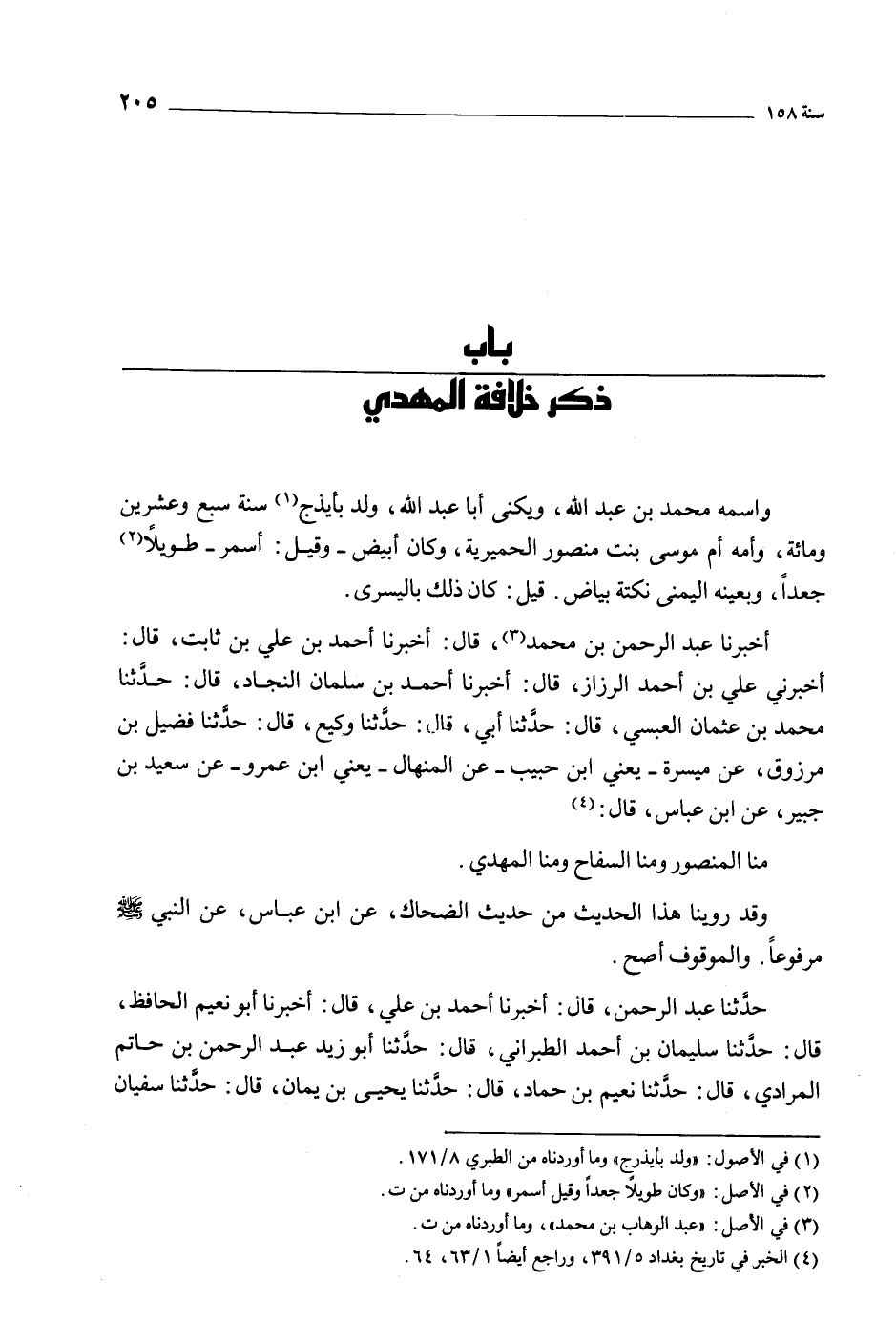 أَخْبَرَنِي عَلِيُّ بْنُ أَحْمَدَ الرَّزَّازُ، قَالَ: أَخْبَرَنَا أَحْمَدُ بْنُ سَلْمَانَ النَّجَّادُ، قَالَ: حَدَّثَنَا مُحَمَّدُ بْنُ عُثْمَانَ الْعَبْسِيُّ، قَالَ: حَدَّثَنَا أَبِي، قَالَ: حَدَّثَنَا وَكِيعٌ، قَالَ: حَدَّثَنَا فُضَيْلُ بْنُ مَرْزُوقٍ، عَنْ مَيْسَرَةَ- يَعْنِي ابْنَ حَبِيبٍ- عَنِ الْمِنْهَالِ- يَعْنِي ابْنَ عَمْرٍو- عَنْ سَعِيدِ بْنِ جُبَيْرٍ، عَنِ ابْنِ عَبَّاسٍ، قَالَ: [4] مِنِّا الْمَنْصُورُ وَمِنَّا السَّفَّاحُ وَمِنَّا الْمَهْدِيُّ.