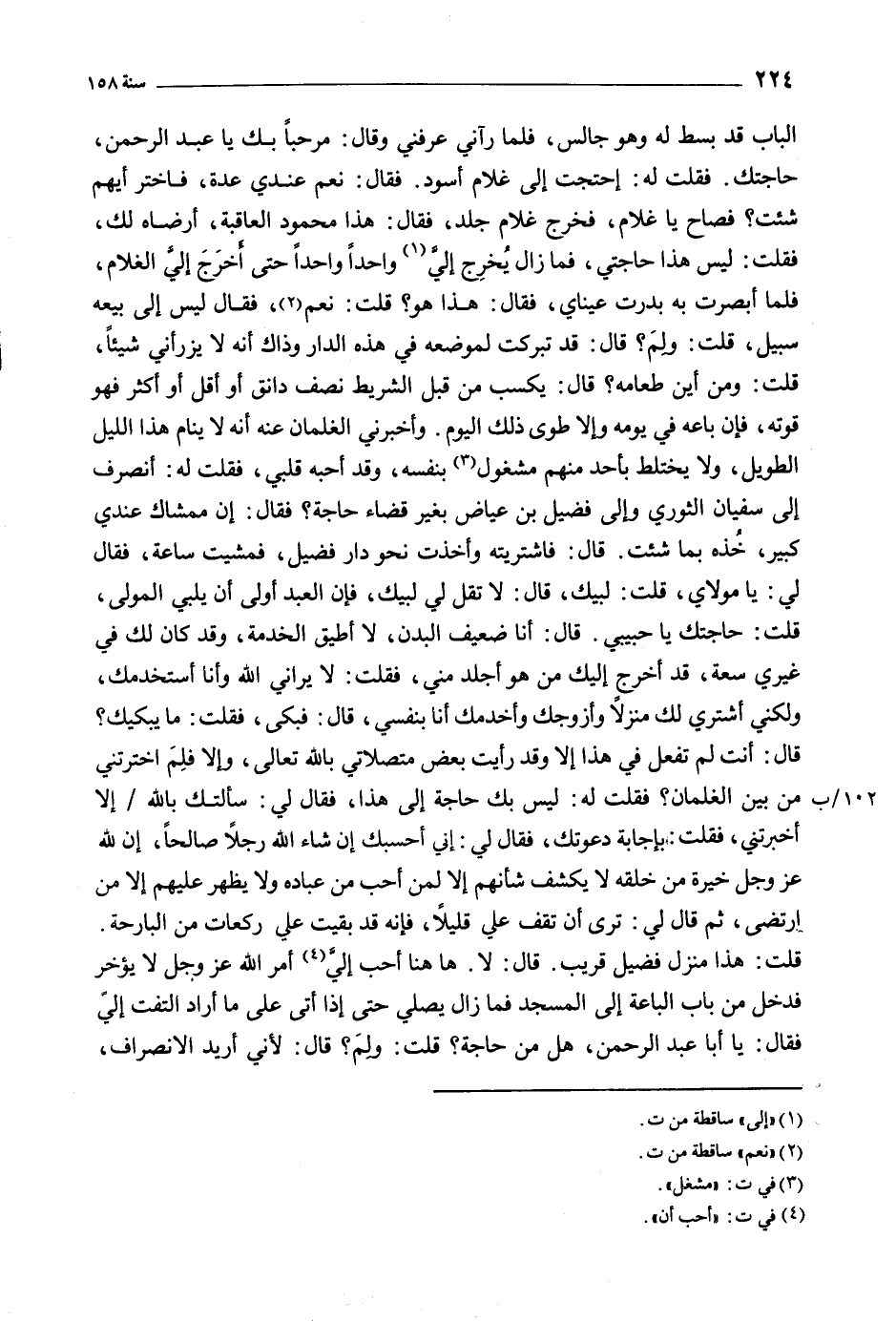 الباب قَدْ بسط لَهُ وَهُوَ جالس، فلما رآني عرفني وَقَالَ: مرحبا بك يا عَبْد الرحمن، حاجتك. فقلت له: احتجت إِلَى غلام أسود. فَقَالَ: نعم عندي عدة، فاختر أيهم شئت؟ فصاح يا غلام، فخرج غلام جلد، فَقَالَ: هَذَا محمود العاقبة، أرضاه لك، فقلت: ليس هَذَا حاجتي، فما زال يخرج إلي [1] واحدا واحدا حَتَّى أخرج إلي الغلام، فلما أبصرت به بدرت عيناي، فَقَالَ: هَذَا هو؟ قلت: نعم [2] ، فَقَالَ ليس إِلَى بيعه سبيل، قلت: ولم؟ قَالَ: قَدْ تبركت لموضعه فِي هَذِهِ الدار وذاك أنه لا يزرأني شيئا، قلت: ومن أين طعامه؟ قَالَ: يكسب من قبل الشريط نصف دانق أو أقل أو أكثر فهو قوته، فإن باعه فِي يومه وإلا طوى ذلك اليوم. وأخبرني الغلمان عنه أنه لا ينام هَذَا الليل الطويل، ولا يختلط بأحد منهم مشغول [3] بْنفسه، وقد أحبه قلبي، فقلت لَهُ: أنصرف إِلَى سفيان الثوري وإلى فضيل بْن عياض بغير قضاء حاجة؟ فَقَالَ: إن ممشاك عندي كبير، خذه بما شئت. قال: فاشتريته وأخذت نحو دار فضيل، فمشيت ساعة، فَقَالَ لي: يا مولاي، قلت: لبيك، قَالَ: لا تقل لي لبيك، فإن العبد أولى أن يلبي المولى، قلت: حاجتك يا حبيبي. قَالَ: أنا ضعيف البدن، لا أطيق الخدمة، وقد كَانَ لك فِي غيري سعة، قَدْ أخرج إليك من هو أجلد مني، فقلت: لا يراني اللَّه وأنا أستخدمك، ولكني أشتري لك منزلا وأزوجك وأخدمك أنا بْنفسي، قَالَ: فبكى، فقلت: مَا يبكيك؟