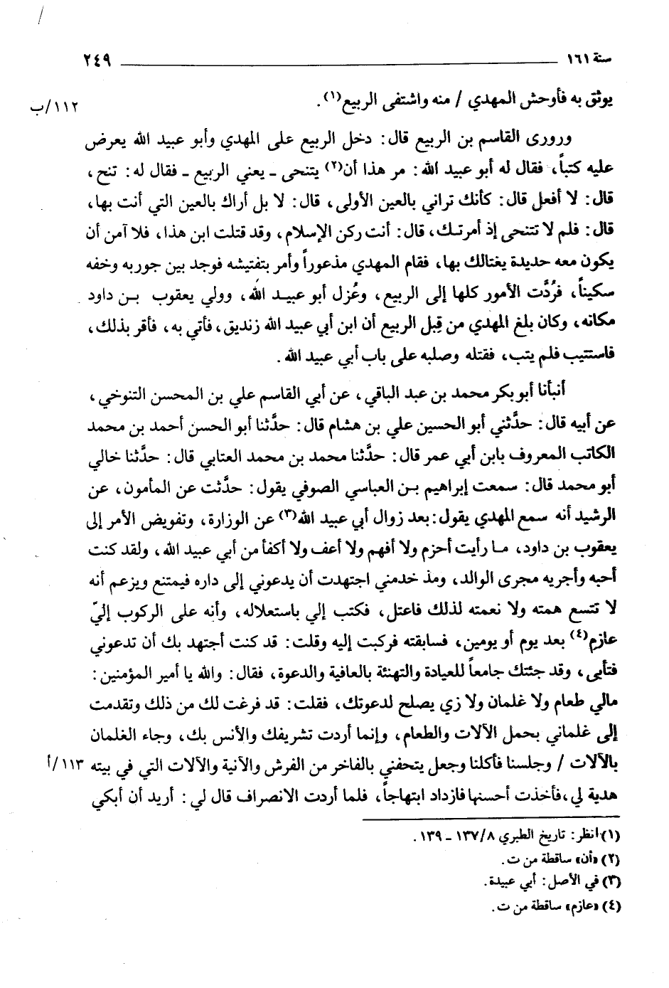 أَنْبَأَنَا أَبُو بَكْرٍ مُحَمَّدُ بْنُ عَبْدِ الْبَاقِي، عَنْ أبي القاسم عَلِي بْن المحسن التنوخي، عَنْ أَبِيهِ قَالَ: حَدَّثَنِي أَبُو الحسين عَلِيّ بْن هِشَام قَالَ: حَدَّثَنَا أَبُو الْحَسَن أَحْمَد بْن مُحَمَّد الكاتب المعروف بابْن أبي عُمَر قَالَ: حَدَّثَنَا مُحَمَّد بْن مُحَمَّد العتابي قَالَ: حَدَّثَنَا خالي أَبُو مُحَمَّد قَالَ: سمعت إِبْرَاهِيم بْن العباسي الصوفي يَقُول: حدثت عَنِ المأمون، عَنِ الرشيد أنه سمع المهدي يقول: بعد زوال أبي عبيد اللَّه [3] عَنِ الوزارة، وتفويض الأمر إِلَى يعقوب بْن داود، مَا رأيت أحزم ولا أفهم ولا أعف ولا أكفأ من أبي عبيد اللَّه، ولقد كنت أحبه وأجريه مجرى الوالد، ومذ خدمني اجتهدت أن يدعوني إِلَى داره فيمتنع ويزعم أنه لا تتسع همته ولا نعمته لذلك فاعتل، فكتب إلي باستعلاله، وأنه عَلَى الركوب إلي عازم [4] بعد يوم أو يومين، فسابقته فركبت إِلَيْهِ وقلت: قَدْ كنت أجتهد بك أن تدعوني فتأبى، وقد جئتك جامعا للعيادة والتهنئة بالعافية والدعوة، فقال: والله يا أمير المؤمنين: