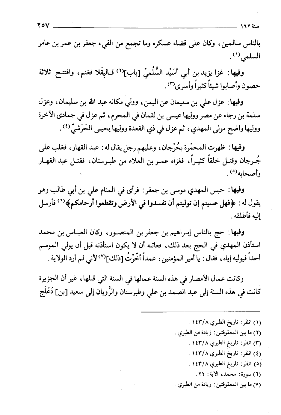 وَفِيهَا: حبس المهدي موسى بْن جَعْفَر: فرأى فِي المنام عَلِيّ بْن أبي طالب وهو يَقُول لَهُ: فَهَلْ عَسَيْتُمْ إِنْ تَوَلَّيْتُمْ أَنْ تُفْسِدُوا في الْأَرْضِ وَتُقَطِّعُوا أَرْحامَكُمْ 47: 22 [6] فأرسل إِلَيْهِ فأطلقه.