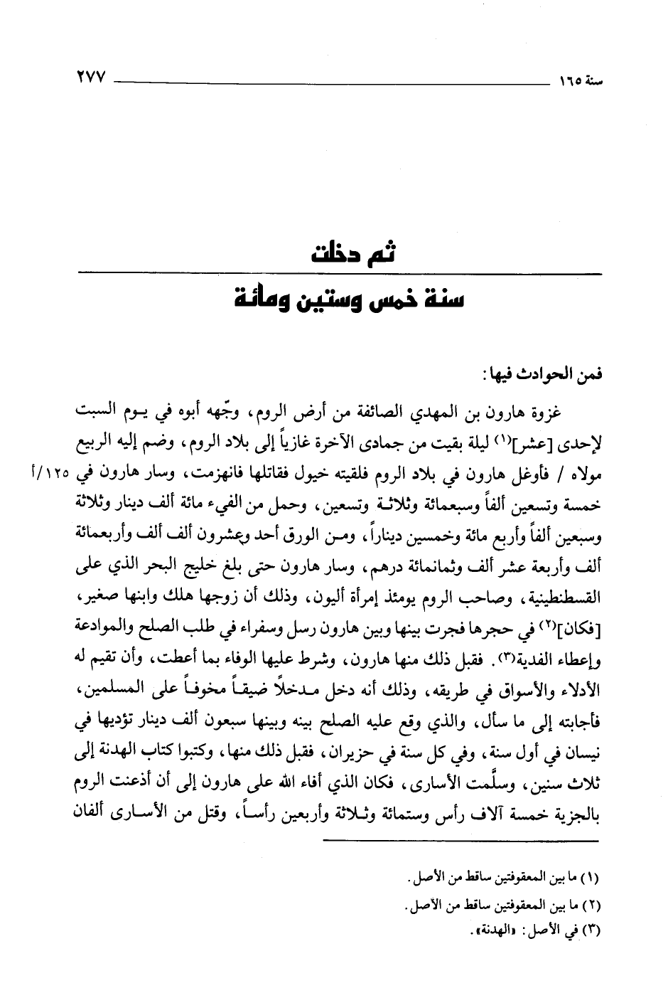 غزوة هارون بْن المهدي الصائفة من أرض الروم، وجهه أبوه فِي يوم السبت لإحدى [عشر] [1] ليلة بقيت من جمادى الآخرة غازيا إِلَى بلاد الروم، وضم إليه الربيع مولاه/ فأوغل هارون فِي بلاد الروم فلقيته خيول فقاتلها فانهزمت، وسار هارون في 125/ أخمسة وتسعين ألفا وسبعمائة وثلاثة وتسعين، وحمل من الفيء مائة ألف دينار وثلاثة وسبعين ألفا وأربع مائة وخمسين دينارا، ومن الورق أحد وعشرون ألف ألف وأربعمائة ألف وأربعة عشر ألف وثمانمائة درهم، وسار هارون حَتَّى بلغ خليج البحر الّذي على القسطنطينية، وصاحب الروم يومئذ امرأة أليون، وذلك أن زوجها هلك وابْنها صغير، [فكان] [2] فِي حجرها فجرت بينها وبين هارون رسل وسفراء فِي طلب الصلح والموادعة وإعطاء الفدية [3] . فقبل ذلك منها هارون، وشرط عليها الوفاء بما أعطت، وأن تقيم لَهُ الأدلاء والأسواق فِي طريقه، وذلك أنه دخل مدخلا ضيقا مخوفا عَلَى المسلمين، فأجابته إِلَى مَا سأل، والذي وقع عليه الصلح بينه وبينها سبعون ألف دينار تؤديها فِي نيسان فِي أول سنة، وفي كل سنة فِي حزيران، فقبل ذلك منها، وكتبوا كتاب الهدنة إِلَى ثلاث سنين، وسلمت الأسارى، فكان الَّذِي أفاء الله على هارون إلى أن أذعنت الروم بالجزية خمسة آلاف رأس وستمائة وثلاثة وأربعين رأسا، وقتل من الأساري ألفان