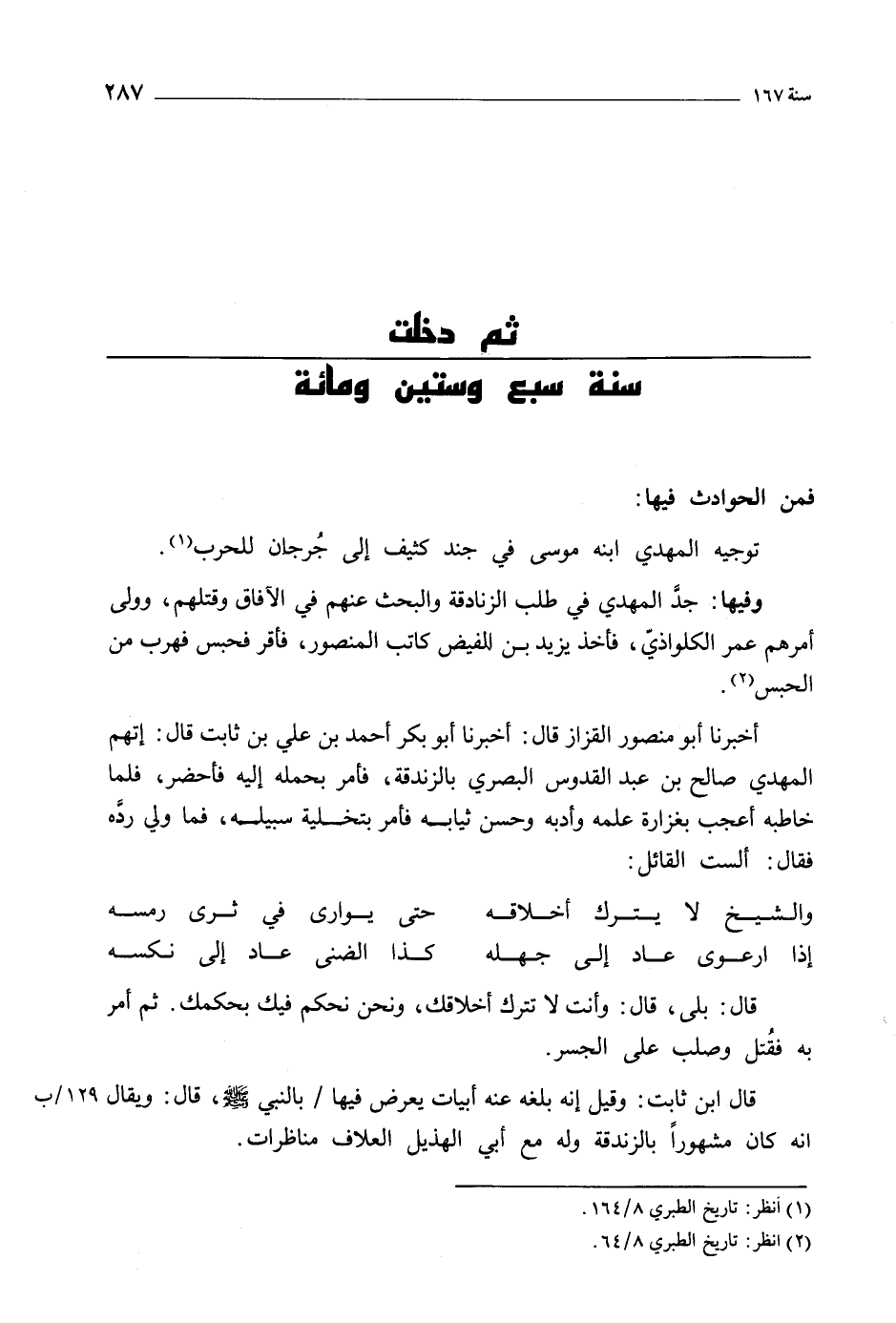 وَفِيهَا: جد المهدي فِي طلب الزنادقة والبحث عنهم فِي الآفاق وقتلهم، وولى أمرهم عمر الكلواذيّ، فأخذ يزيد بْن الفيض كاتب المنصور، فأقر فحبس فهرب من الحبس [2] .