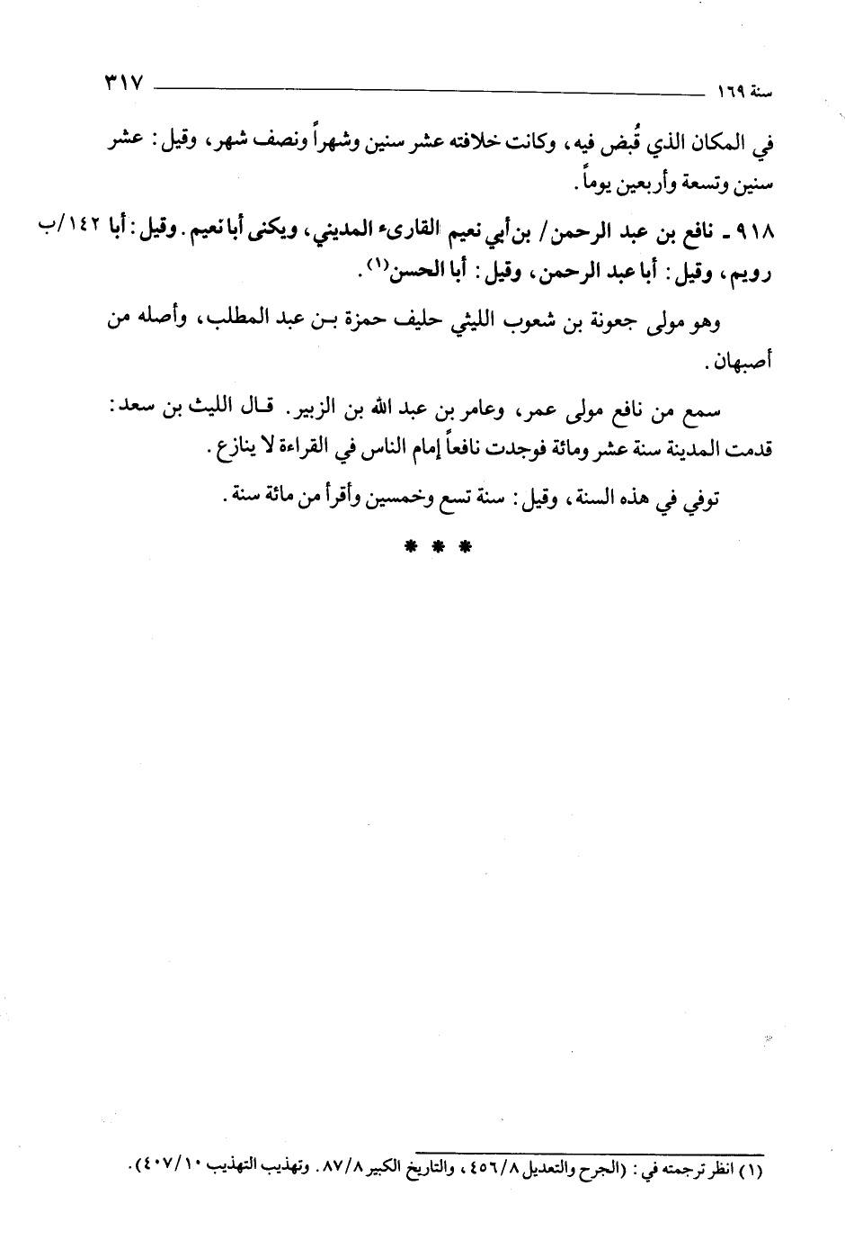 918- نافع بْن عَبْد الرَّحْمَنِ/ بْن أبي نعيم الْقَارِئ المديني، ويكنى أبا نعيم. وقيل: أبا 142/ ب رويم، وقيل: أبا عَبْد الرَّحْمَنِ، وقيل: أبا الْحَسَن [1] .