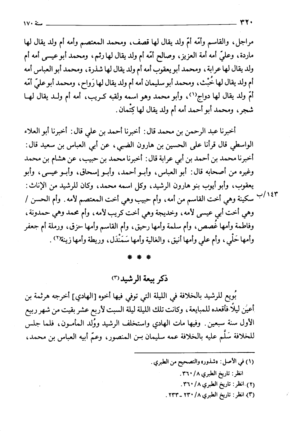 [3] بويع للرشيد بالخلافة فِي الليلة الَّتِي تُوُفِّيَ فِيهَا أخوه [الهادي] أخرجه هرثمة بْن أعين ليلا فأقعده للمبايعة، وكانت تلك الليلة ليلة السبت لأربع عشر بقيت من شهر ربيع الأول سنة سبعين. وَفِيهَا مات الهادي واستخلف الرشيد وولد المأمون، فلما جلس للخلافة سلم عليه بالخلافة عمه سليمان بْن المنصور، وعم أبيه العباس بن محمد،