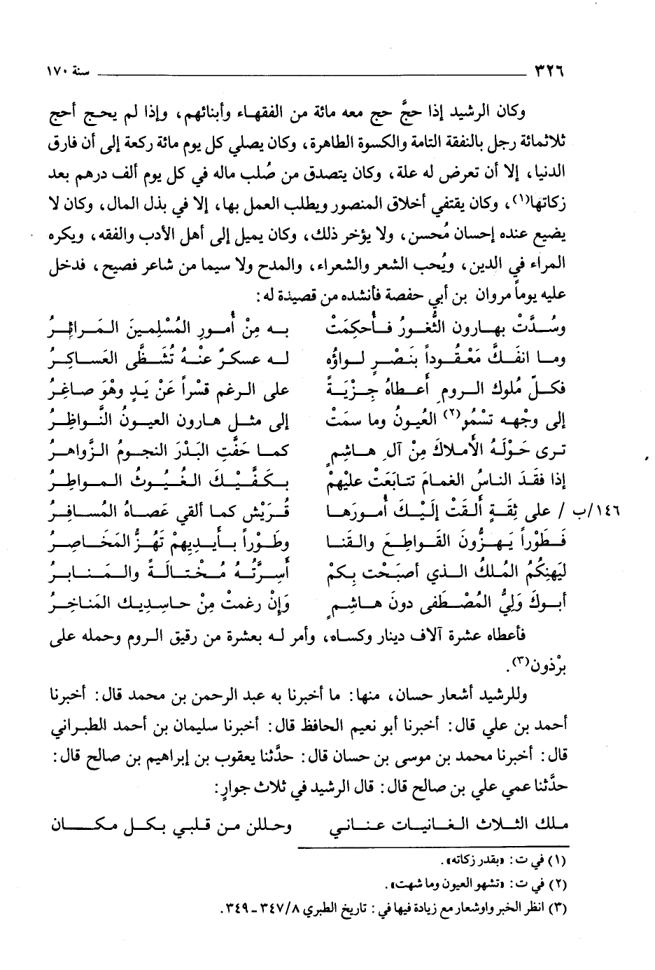 وَكَانَ الرشيد إذا حج حج معه مائة من الفقهاء وأبْنائهم، وإذا لم يحج أحج ثلاثمائة رَجُل بالنفقة التامة والكسوة الطاهرة، وَكَانَ يصلي كل يوم مائة ركعة إِلَى أن فارق الدُّنيا، إلا أن تعرض لَهُ علة، وَكَانَ يتصدق من صلب ماله فِي كل يوم ألف درهم بعد زكاتها [1] ، وَكَانَ يقتفي أخلاق المنصور ويطلب العمل بها، إلا فِي بذل المال، وكان لا يضيع عنده إحسان محسن، ولا يؤخر ذلك، وَكَانَ يميل إِلَى أَهْل الأدب والفقه، ويكره المراء فِي الدين، ويحب الشعر والشعراء، والمدح ولا سيما من شاعر فصيح، فدخل عليه يوما مروان بْن أبي حفصة فأنشده من قصيدة لَهُ: