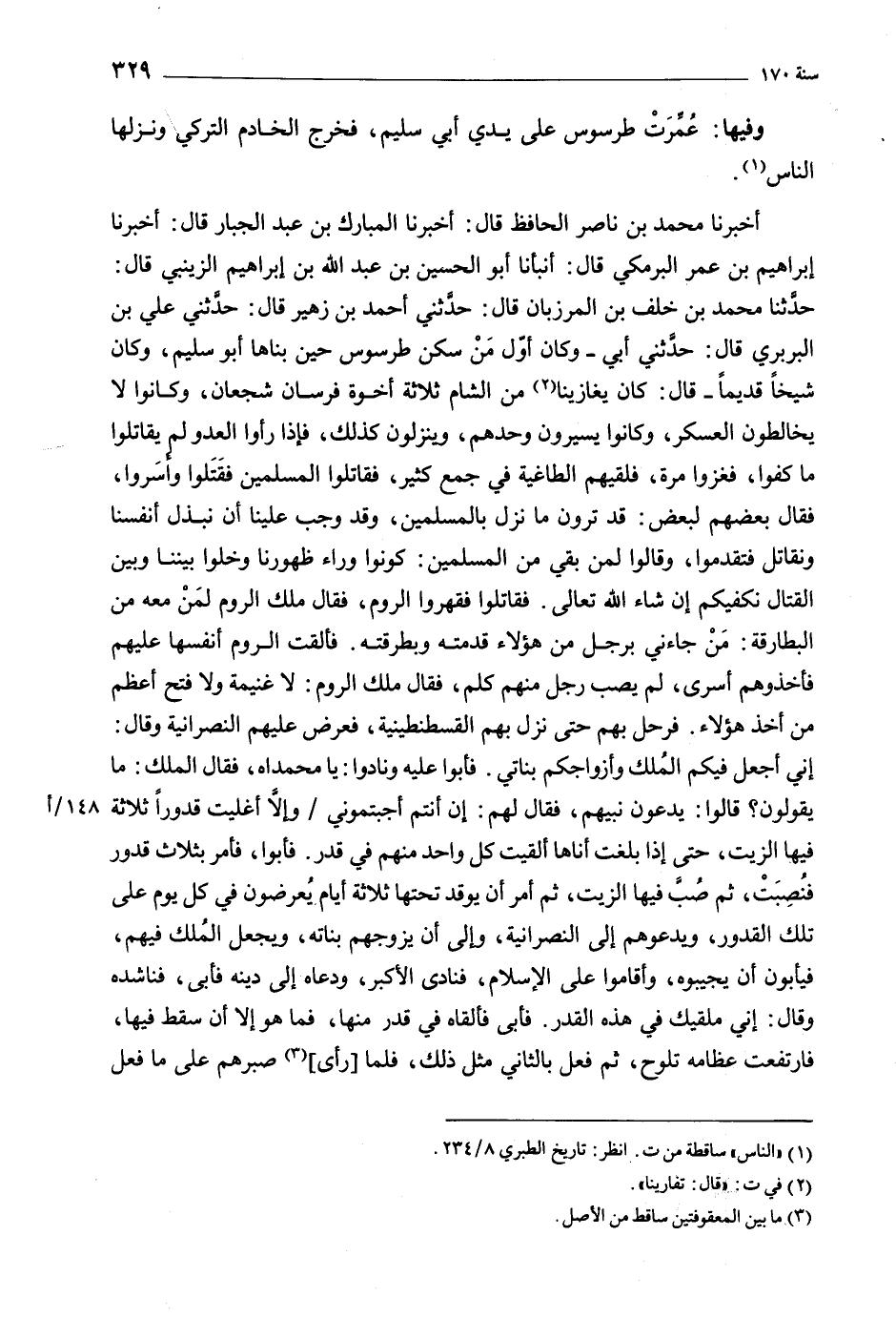 حَدَّثَنَا مُحَمَّد بن خلف بن المرزبان قال: حدثني أحمد بْن زهير قَالَ: حَدَّثَنِي عَلِيّ بْن البربري قَالَ: حَدَّثَنِي أبي- وَكَانَ أول من سكن طرسوس حين بْناها أَبُو سليم، وَكَانَ شيخا قديما- قَالَ: كَانَ يغازينا [2] من الشام ثلاثة أخوة فرسان شجعان، وكانوا لا يخالطون العسكر، وكانوا يسيرون وحدهم، وينزلون كذلك، فإذا رأوا العدو لم يقاتلوا مَا كفوا، فغزوا مرة، فلقيهم الطاغية في جمع كثير، فقاتلوا المسلمين فقتلوا وأسروا، فَقَالَ بعضهم لبعض: قَدْ ترون مَا نزل بالمسلمين، وقد وجب علينا أن نبذل أنفسنا ونقاتل فتقدموا، وقالوا لمن بقي من المسلمين: كونوا وراء ظهورنا وخلوا بيننا وبين القتال نكفيكم إن شاء الله تعالى. فقاتلوا فقهروا الروم، فَقَالَ ملك الروم لمن معه من البطارقة: من جاءني برجل من هؤلاء قدمته وبطرقته. فألقت الروم أنفسها عليهم فأخذوهم أسرى، لم يصب رجل منهم كلم، فَقَالَ ملك الروم: لا غنيمة ولا فتح أعظم من أخذ هؤلاء. فرحل بهم حَتَّى نزل بهم القسطنطينية، فعرض عليهم النصرانية وَقَالَ: