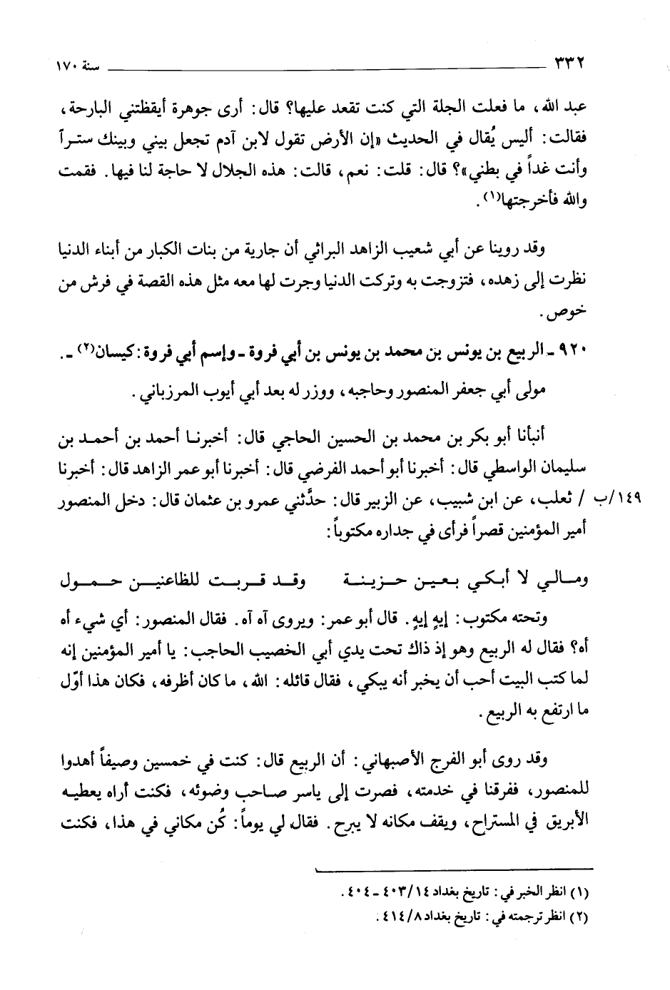 أَنْبَأَنَا أَبُو بكر بْن مُحَمَّد بْن الحسين الحاجي قَالَ: أَخْبَرَنَا أَحْمَد بْن أَحْمَد بْن سليمان الواسطي قَالَ: أَخْبَرَنَا أَبُو أَحْمَد الفرضي قَالَ: أَخْبَرَنَا أَبُو عمر الزاهد قال: أخبرنا 149/ ب/ ثعلب، عن ابن شبيب، عن الزُّبَيْر قَالَ: حَدَّثَنِي عَمْرو بْن عُثْمَان قَالَ: دخل المنصور أمير المؤمنين قصرا فرأى في جداره مكتوبا:
