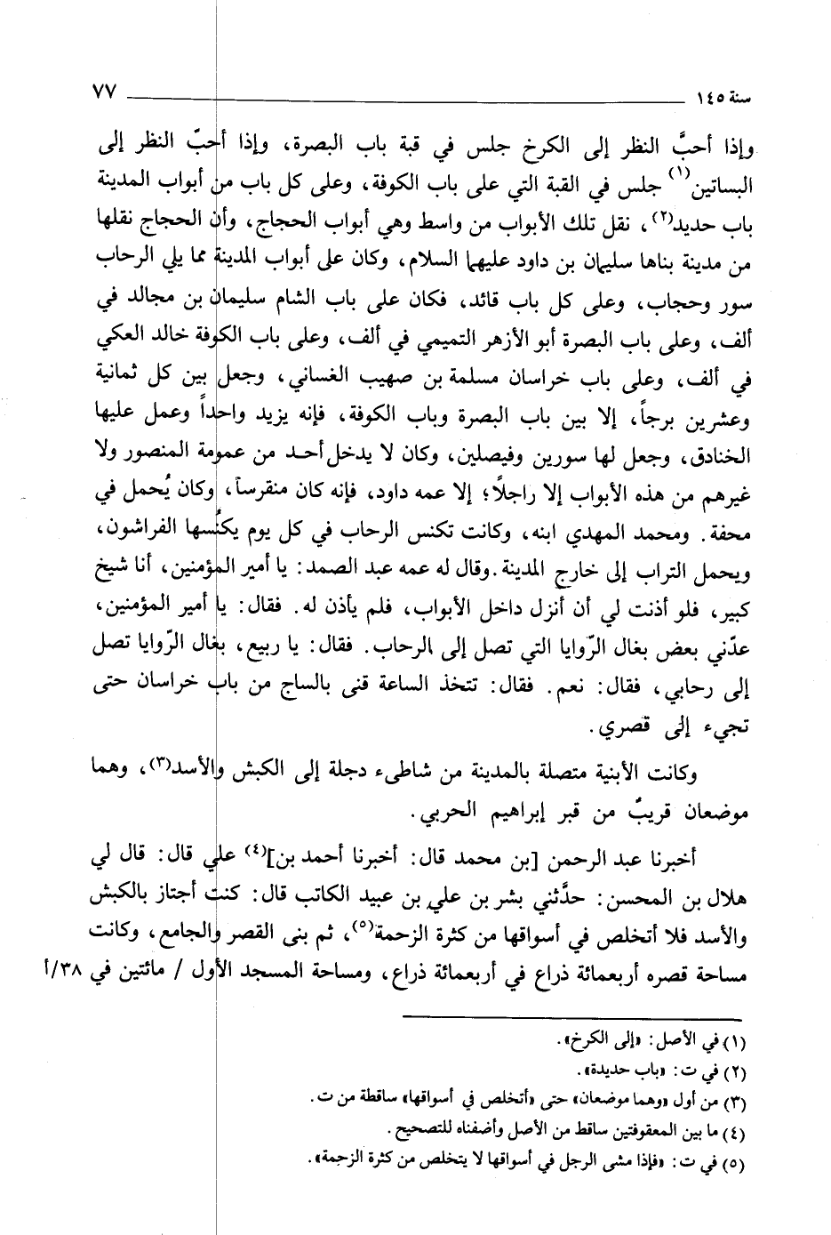 وَإِذَا أحب النظر إِلَى الكرخ جلس فِي قبة باب البصرة، وإذا أحب النظر إِلَى البساتين [1] جلس فِي القبة الَّتِي على باب الكوفة، وعلى كل باب من أبواب المدينة باب حديد [2] ، نقل تلك الأبواب من واسط وهي أبواب الحجاج، وأن الحجاج نقلها من مدينة بْناها سليمان بْن داود عليهما السلام، وَكَانَ على أبواب المدينة مما يلي الرحاب سور وحجاب، وعلى كل باب قائد، فكان على باب الشام سليمان بْن مجالد فِي ألف، وعلى باب البصرة أَبُو الأزهر التَّمِيمِيّ فِي ألف، وعلى باب الكوفة خالد العكي فِي ألف، وعلى باب خراسان مسلمة بْن صهيب الغساني، وجعل بين كل ثمانية وعشرين برجا، إلا بين باب البصرة وباب الكوفة، فإنه يزيد واحدا وعمل عَلَيْهَا الخنادق، وجعل لها سورين وفيصلين، وَكَانَ لا يدخل أحد من عمومة المنصور ولا غيرهم من هَذِهِ الأبواب إلا راجلا، إلا عمه داود، فإنه كَانَ منقرسا، وَكَانَ يحمل فِي محفة. ومحمد المهدي ابْنه، وكانت تكنس الرحاب فِي كل يوم يكنسها الفراشون، ويحمل التراب إِلَى خارج المدينة. وَقَالَ لَهُ عمه عَبْد الصمد: يَا أَمِيرَ الْمُؤْمِنِينَ، أنا شيخ كبير، فلو أذنت لي أن أنزل داخل الأبواب، فلم يأذن لَهُ. فَقَالَ: يَا أَمِيرَ الْمُؤْمِنِينَ، عدني بعض بغال الرّوايا التي تصل إِلَى الرحاب. فَقَالَ: يا ربيع، بغال الروايا تصل إِلَى رحابي، فَقَالَ: نعم. فَقَالَ: تتخذ الساعة قنى بالساج من باب خراسان حَتَّى تجيء إِلَى قصري.