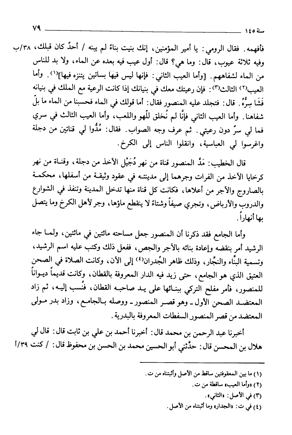 فأفهمه. فَقَالَ الرومي: يَا أَمِيرَ الْمُؤْمِنِينَ، إنك بْنيت بْناء لم يبْنه/ أحد كَانَ قبلك، 38/ ب وفيه ثلاثة عيوب، قَالَ: وما هي؟ قَالَ: أول عيب فِيهِ بعده عَنِ الماء، ولا بد للناس من الماء لشفاههم. [وأما العيب الثاني: فإنها ليس فِيهَا بساتين يتنزه فِيهَا] [1] . وأما العيب [2] الثالث [3] : فإن رعيتك معك فِي بْنيانك إذا كانت الرعية مَعَ الملك فِي بْنيانه فشا سره. قَالَ: فتجلد عليه المنصور فَقَالَ: أما قولك فِي الماء فحسبْنا من الماء ما بلّ شفاهنا. وأما العيب الثاني فإنا لم نخلق للهو واللعب، وأما العيب الثالث فِي سري فما لي سر دون رعيتي. ثم عرف وجه الصواب. فَقَالَ: مدوا لي قناتين من دجلة واغرسوا لي العباسية، وانقلوا الناس إلى الكرخ.