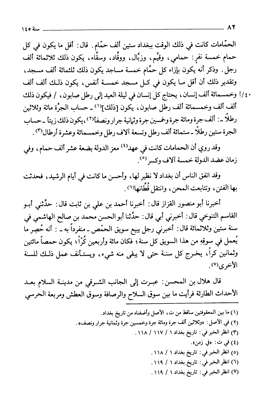 الحمامات كانت فِي ذلك الوقت ببغداد ستين ألف حمام. قَالَ: أقل مَا يكون فِي كل حمام خمسة نفر: حمامي، وقيم، وزبال، ووقّاد، وسقّاء، يكون ذلك ثلاثمائة ألف رجل. وذكر أنه يكون بإزاء كل حمّام خمسة مساجد يكون ذلك ثلاثمائة ألف مسجد، وتقدير ذلك أن أقل مَا يكون فِي كل مسجد خمسة أنفس، يكون ذلك ألف ألف 40/ أوخمسمائة ألف إنسان، يحتاج كل إنسان فِي ليلة العيد إلى رطل صابون، / فيكون ذلك ألف ألف وخمسمائة ألف رطل صابون، يكون [ذلك] [1]- حساب الجرة مائة وثلاثين رطلا-: ألف جرة ومائة جرة وخمسين جرة وثمانية جرار ونصفا [2] ، يكون ذلك زيتا- حساب الجرة ستين رطلا- ستمائة ألف رطل وتسعة آلاف رطل وخمسمائة وعشرة أرطال [3] .