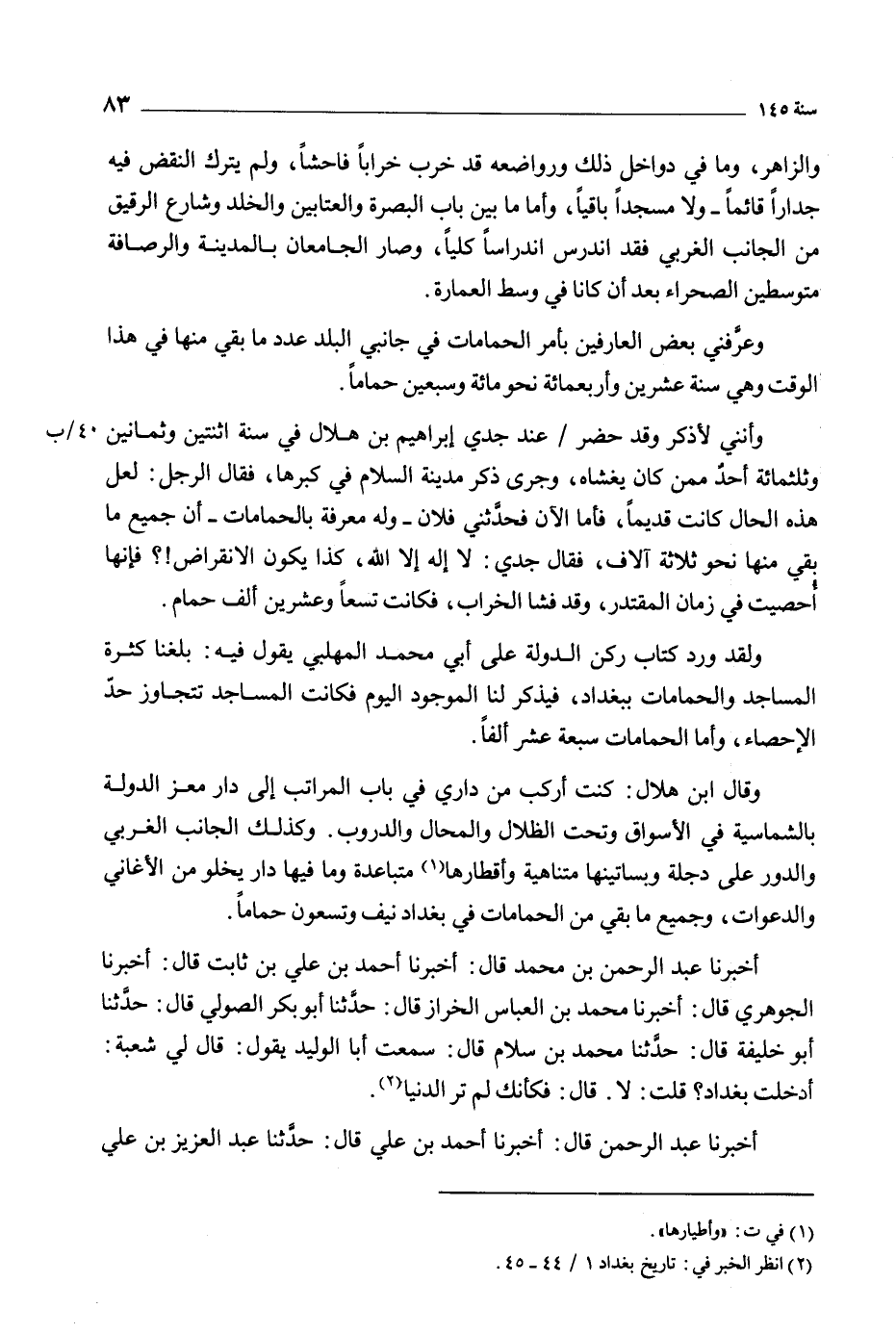 وأنني لأذكر وقد حضر/ عند جدي إِبْرَاهِيم بْن هلال فِي سنة اثنتين وثمانين 40/ ب وثلاثمائة أحد ممن كَانَ يغشاه، وجرى ذكر مدينة السلام فِي كبرها، فَقَالَ الرجل: لعل هَذِهِ الحال كانت قديما، فأما الآن فحدثني فلان- وله- معرفة بالحمامات- أن جميع مَا بقي منها نحو ثلاثة آلاف، فَقَالَ جدي: لا إله إلا اللَّه، كذا يكون الانقراض!؟ فإنها أحصيت فِي زمان المقتدر، وقد فشا الخراب، فكانت تسعا وعشرين ألف حمام.