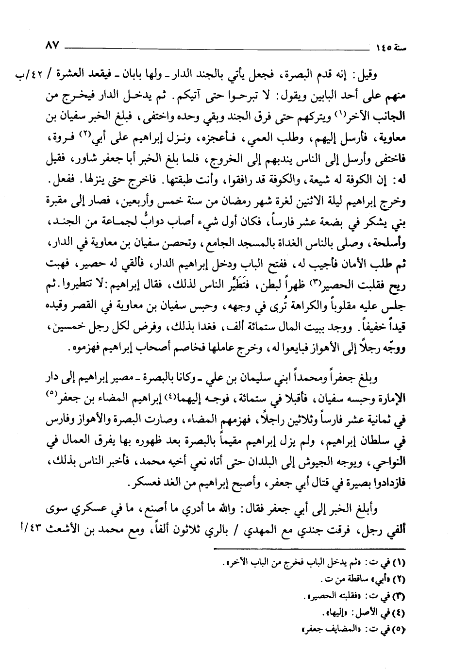 وبلغ جعفرا ومحمدا ابْني سليمان بْن عَلِيّ- وكانا بالبصرة- مصير إِبْرَاهِيم إِلَى دار الإمارة وحبسه سفيان، فأقبلا في ستمائة، فوجه إليهما [4] إِبْرَاهِيم المضاء بْن جَعْفَر [5] فِي ثمانية عشر فارسا وثلاثين راجلا، فهزمهم المضاء، وصارت البصرة والأهواز وفارس في سلطان إِبْرَاهِيم، ولم يزل إِبْرَاهِيم مقيما بالبصرة بعد ظهوره بها يفرق العمال فِي النواحي، ويوجه الجيوش إِلَى البلدان حَتَّى أتاه نعي أخيه محمد، فأخبر الناس بذلك، فازدادوا بصيرة فِي قتال أبي جَعْفَر، وأصبح إِبْرَاهِيم من الغد فعسكر.