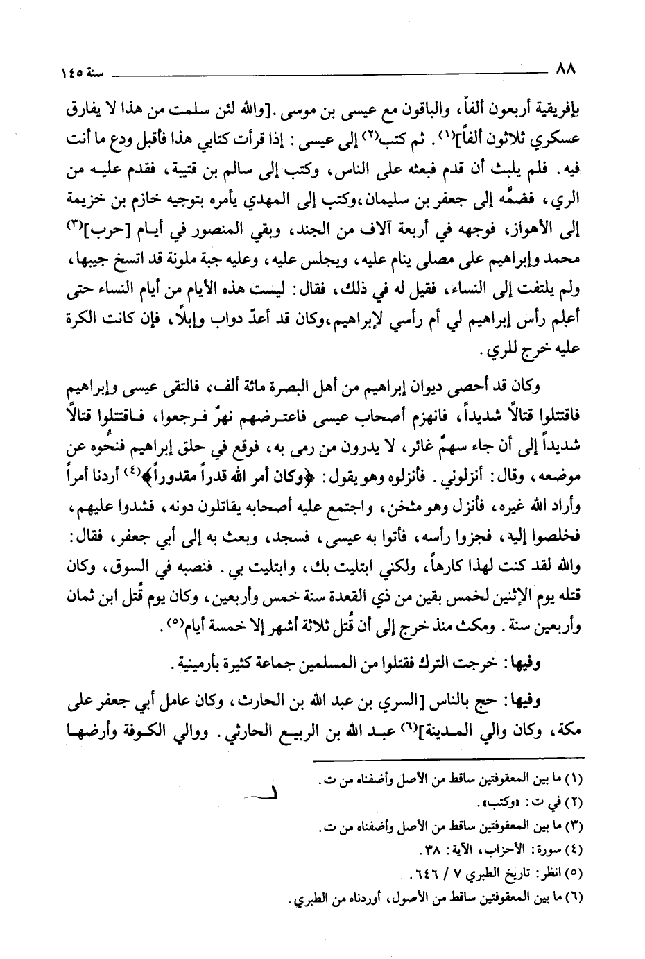 وَكَانَ قَدْ أحصى ديوان إِبْرَاهِيم من أَهْل البصرة مائة ألف، فالتقى عيسى وإبراهيم فاقتتلوا قتالا شديدا، فانهزم أصحاب عيسى فاعترضهم نهر فرجعوا، فاقتتلوا قتالا شديدا إلى أن جاء سهم غائر، لا يدرون من رمى به، فوقع فِي حلق إِبْرَاهِيم فنحوه عن موضعه، وقال: أنزلوني. فأنزلوه وَهُوَ يَقُول: وَكانَ أَمْرُ اللَّهِ قَدَراً مَقْدُوراً 33: 38 [4] أردنا أمرا وأراد اللَّه غيره، فأنزل وَهُوَ مثخن، واجتمع عليه أصحابه يقاتلون دونه، فشدوا عليهم، فخلصوا إِلَيْهِ، فجزوا رأسه، فأتوا به عيسى، فسجد، وبعث به إِلَى أبي جَعْفَر، فقال: