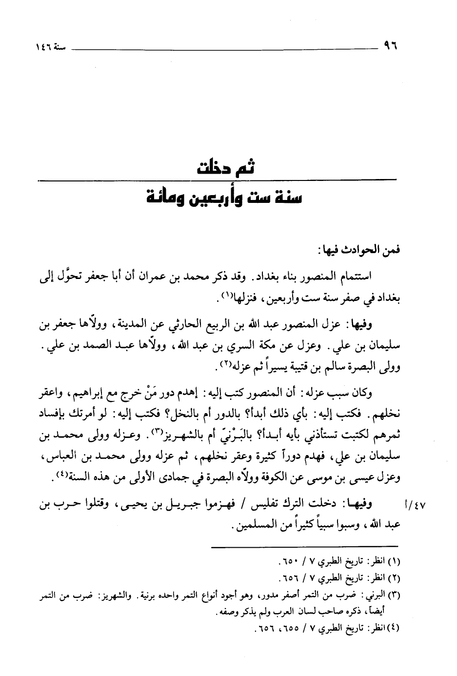 استتمام المنصور بْناء بغداد. وقد ذكر مُحَمَّد بْن عمران أن أبا جَعْفَر تحوّل إلى بغداد في صفر سنة ست وأربعين، فنزلها [1] .