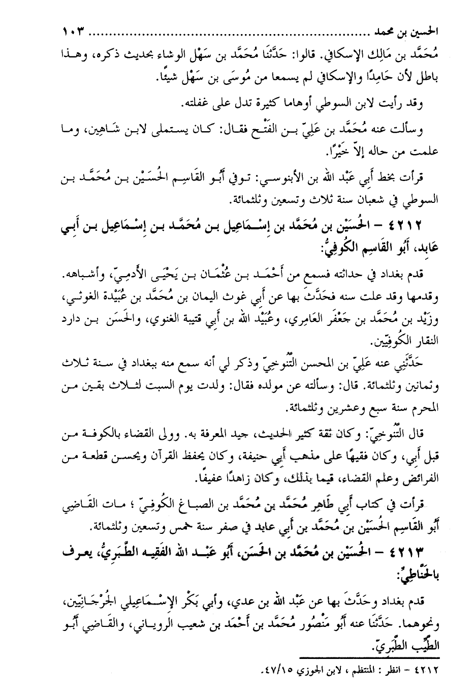 4212- الْحُسَيْن بْن مُحَمَّد بْن إِسْمَاعِيل بْن مُحَمَّد بْن إِسْمَاعِيل بن أبي عابد، أَبُو الْقَاسِمِ الكوفي [1] :