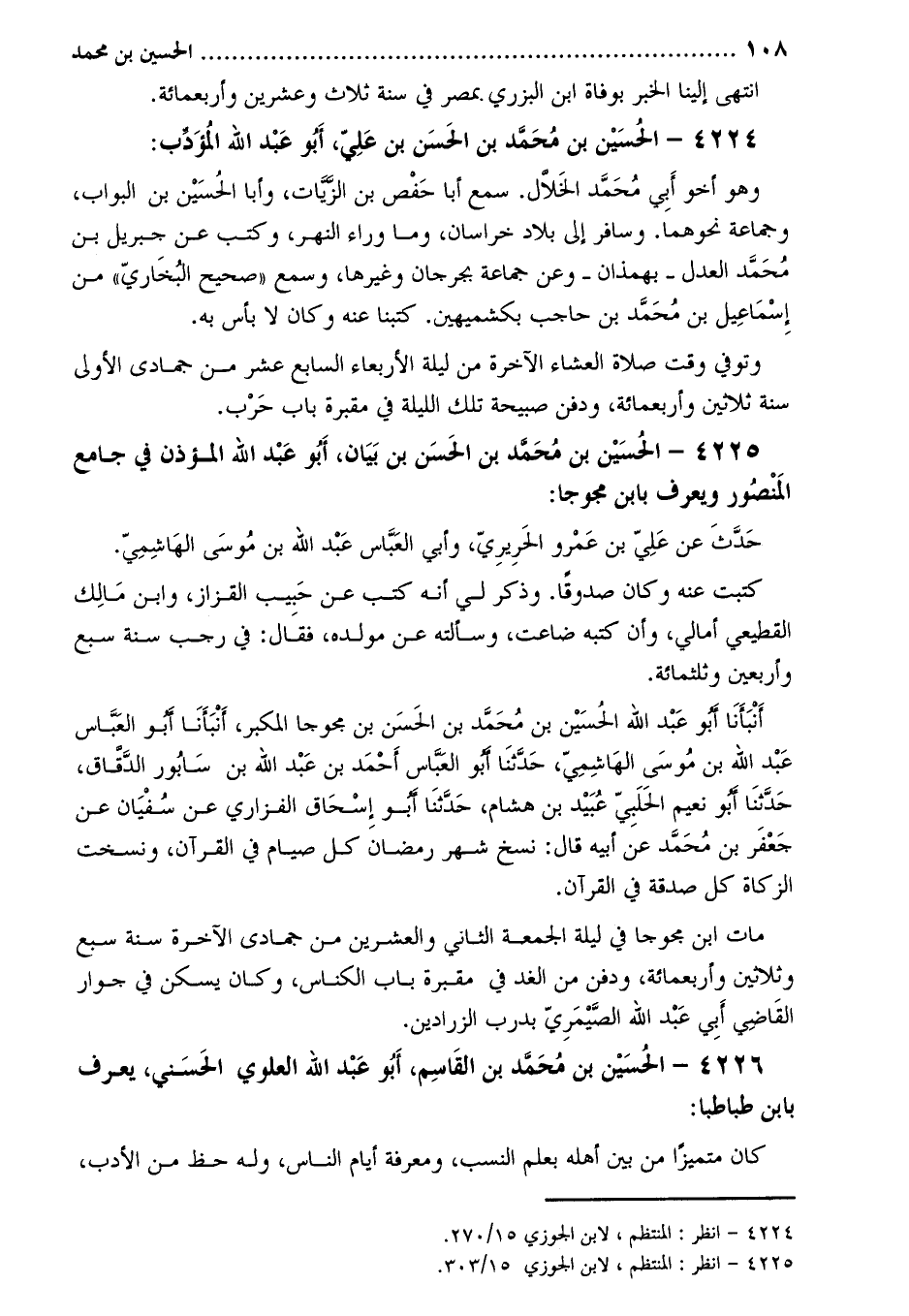 4225- الْحُسَيْن بْنُ مُحَمَّدِ بْنِ الْحَسَن بْنِ بَيَانٍ، أَبُو عَبْدِ اللَّهِ المؤذن فِي جامع المنصور ويعرف بابن مجوجا [2] :