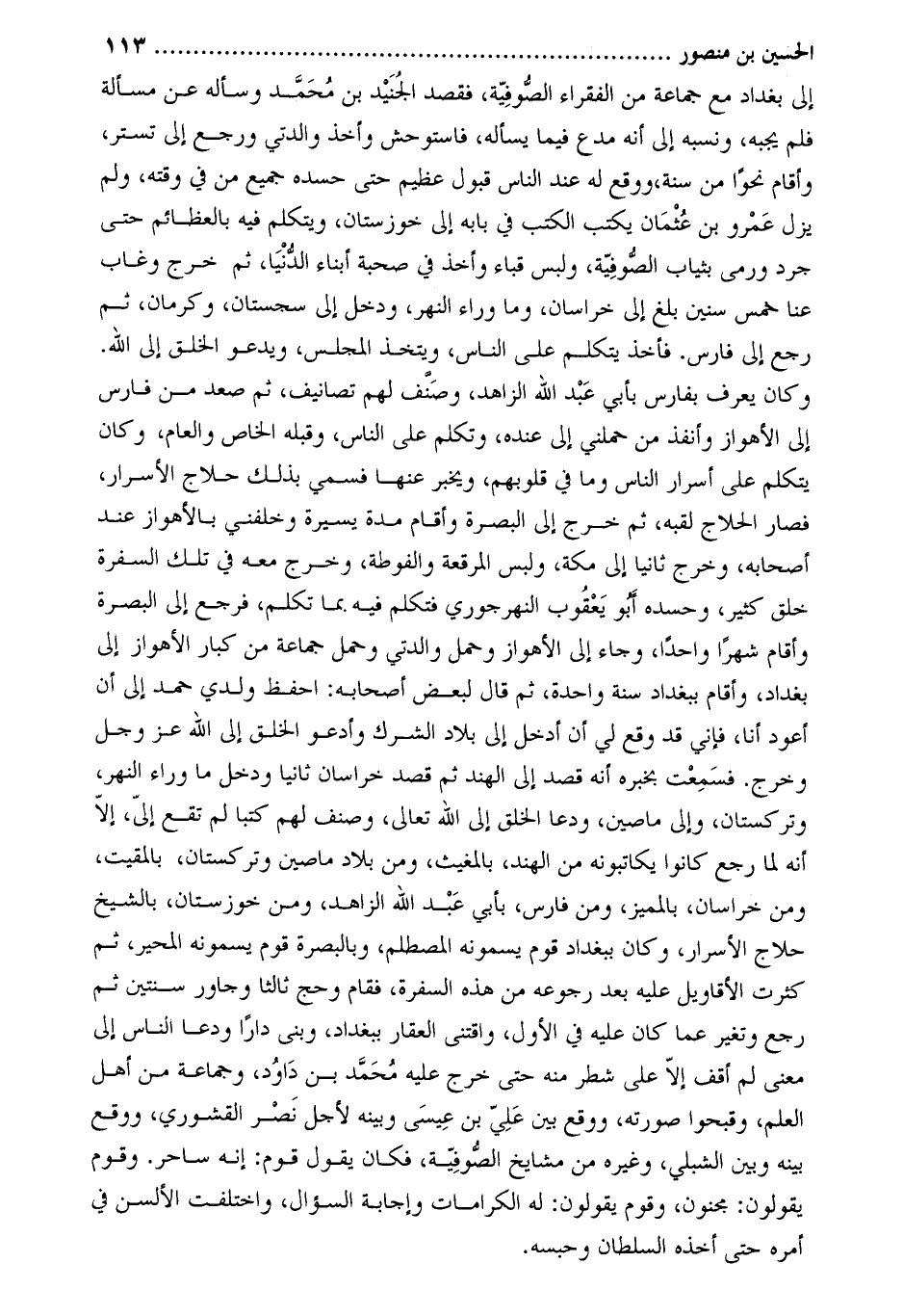 إِلَى بَغْدَاد مع جماعة من الفقراء الصوفية، فقصد الجنيد بن مُحَمَّد وسأله عَنْ مسألة فلم يجبه، ونسبه إِلَى أَنَّهُ مدع فيما يسأله، فاستوحش وأخذ والدتي ورجع إِلَى تستر، وأقام نحوا من سنة، ووقع لَهُ عند الناس قبول عظيم حتى حسده جميع من فِي وقته، ولم يزل عمرو بن عُثْمَان يكتب الكتب فِي بابه إِلَى خوزستان، ويتكلم فيه بالعظائم حتى جرد ورمى بثياب الصوفية، ولبس قباء وأخذ فِي صحبة أبناء الدنيا، ثم خرج وغاب عنا خمس سنين بلغ إِلَى خراسان، وما وراء النهر، ودخل إِلَى سجستان، وكرمان، ثم رجع إِلَى فارس. فأخذ يتكلم عَلَى الناس، ويتخذ المجلس، ويدعو الخلق إِلَى اللَّه.