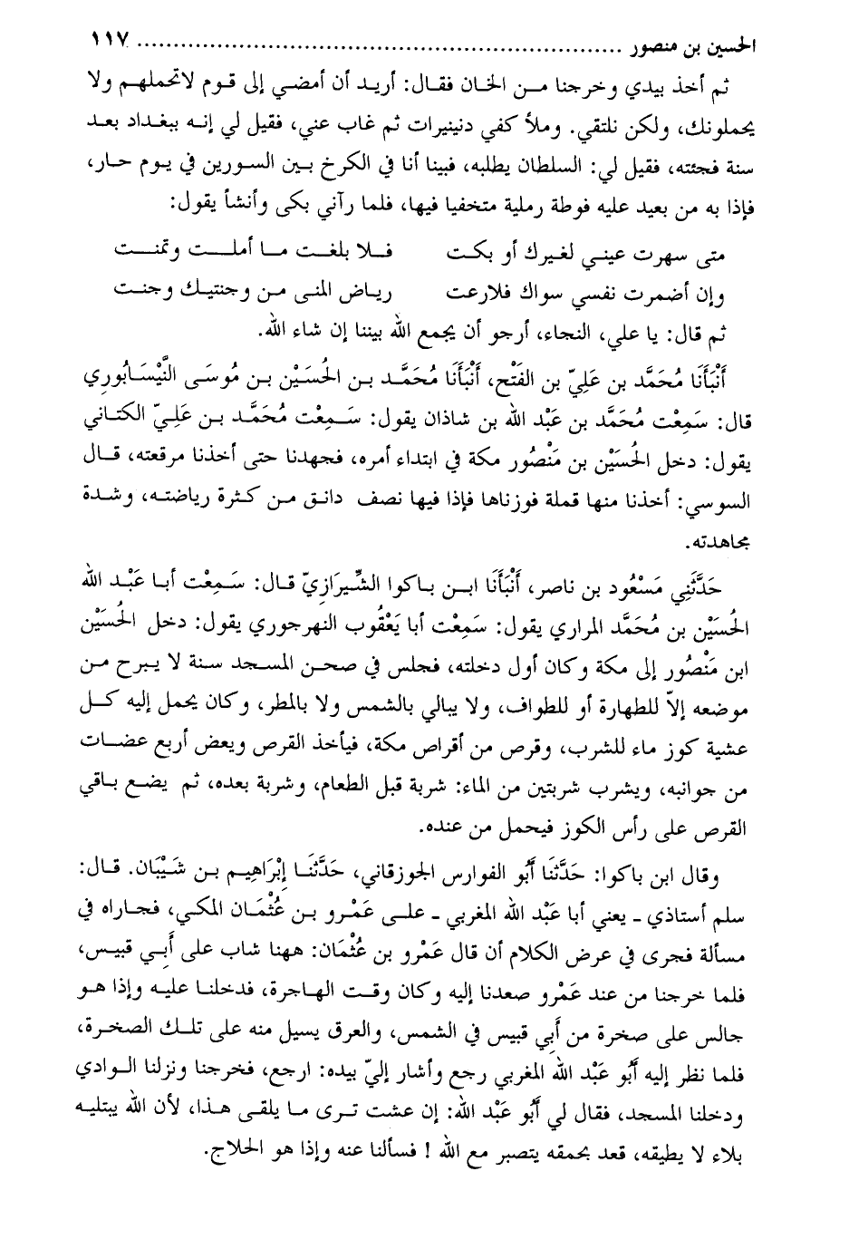 سلم أستاذي- يعني أبا عَبْد اللَّهِ المغربي- عَلَى عمرو بن عُثْمَان المكي، فجاراه فِي مسألة فجرى فِي عرض الكلام أن قَالَ عمرو بن عُثْمَان: هاهنا شاب عَلَى أَبِي قبيس، فلما خرجنا من عند عمرو صعدنا إليه وكان وقت الهاجرة، فدخلنا عليه وإذا هو جالس عَلَى صخرة من أَبِي قبيس فِي الشمس، والعرق يسيل منه عَلَى تلك الصخرة، فلما نظر إليه أَبُو عَبْدِ اللَّهِ المغربي رجع وأشار إلي بيده: ارجع، فخرجنا ونزلنا الوادي ودخلنا المسجد، فَقَالَ لِي أَبُو عَبْدِ اللَّهِ: إن عشت ترى ما يلقى هذا، لأن اللَّه يبتليه بلاء لا يطيقه، قعد بحمقه يتصبر مع اللَّه! فسألنا عنه وإذا هو الحلاج.