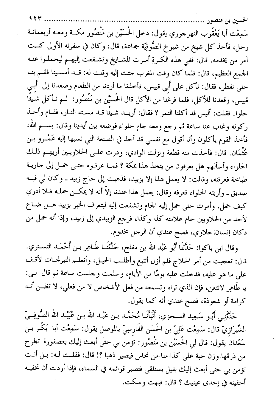 سمعت أبا يَعْقُوب النهرجوري يَقُولُ: دخل الْحُسَيْن بن منصور مكة ومعه أربعمائة رجل، فأخذ كل شيخ من شيوخ الصوفية جماعة، قَالَ: وكان فِي سفرته الأولى كنت آمر من يخدمه. قَالَ: ففي هذه الكرة أمرت المشايخ وتشفعت إليهم ليحملوا عنه الجمع العظيم، قَالَ: فلما كَانَ وقت المغرب جئت إليه وقلت لَهُ: قد أمسينا فقم بنا حتى نفطر، فَقَالَ: نأكل عَلَى أَبِي قبيس، فأخذنا ما أردنا من الطعام وصعدنا إِلَى أَبِي قبيس، وقعدنا للأكل، فلما فرغنا من الأكل قَالَ الْحُسَيْن بن مَنْصُور: لم نأكل شيئا حلوا. فقلت: أليس قد أكلنا التمر؟ فَقَالَ: أريد شيئا قد مسته النار، فقام وأخذ ركوته وغاب عنا ساعة ثم رجع ومعه جام حلواء فوضعه بين أيدينا وَقَالَ: بسم الله، فأخذ القوم يأكلون وأنا أقول مع نفسي قد أخذ فِي الصنعة التي نسبها إليه عمرو بن عُثْمَان. قَالَ: فأخذت منه قطعة ونزلت الوادي، ودرت عَلَى الحلاويين أريهم ذلك الحلواء وأسألهم هل يعرفون من يتخذ هذا بمكة؟ فما عرفوه حتى حمل إِلَى جارية طباخة فعرفته، وَقَالَتْ: لا يعمل هذا إِلا بزبيد، فذهبت إِلَى حاج زبيد- وكان لِي فيه صديق- وأريته الحلواء فعرفه وَقَالَ: يعمل هذا عندنا إِلا أَنَّهُ لا يمكن حمله فَلا أدري كيف حمل. وأمرت حتى حمل إليه الجام وتشفعت إليه ليتعرف الخبر بزبيد هل ضاع لأحد من الحلاويين جام علامته كذا وكذا، فرجع الزبيدي إِلَى زبيد، وإذا أَنَّهُ حمل من دكان إنسان حلاوي، فصح عندي أن الرجل مخدوم.