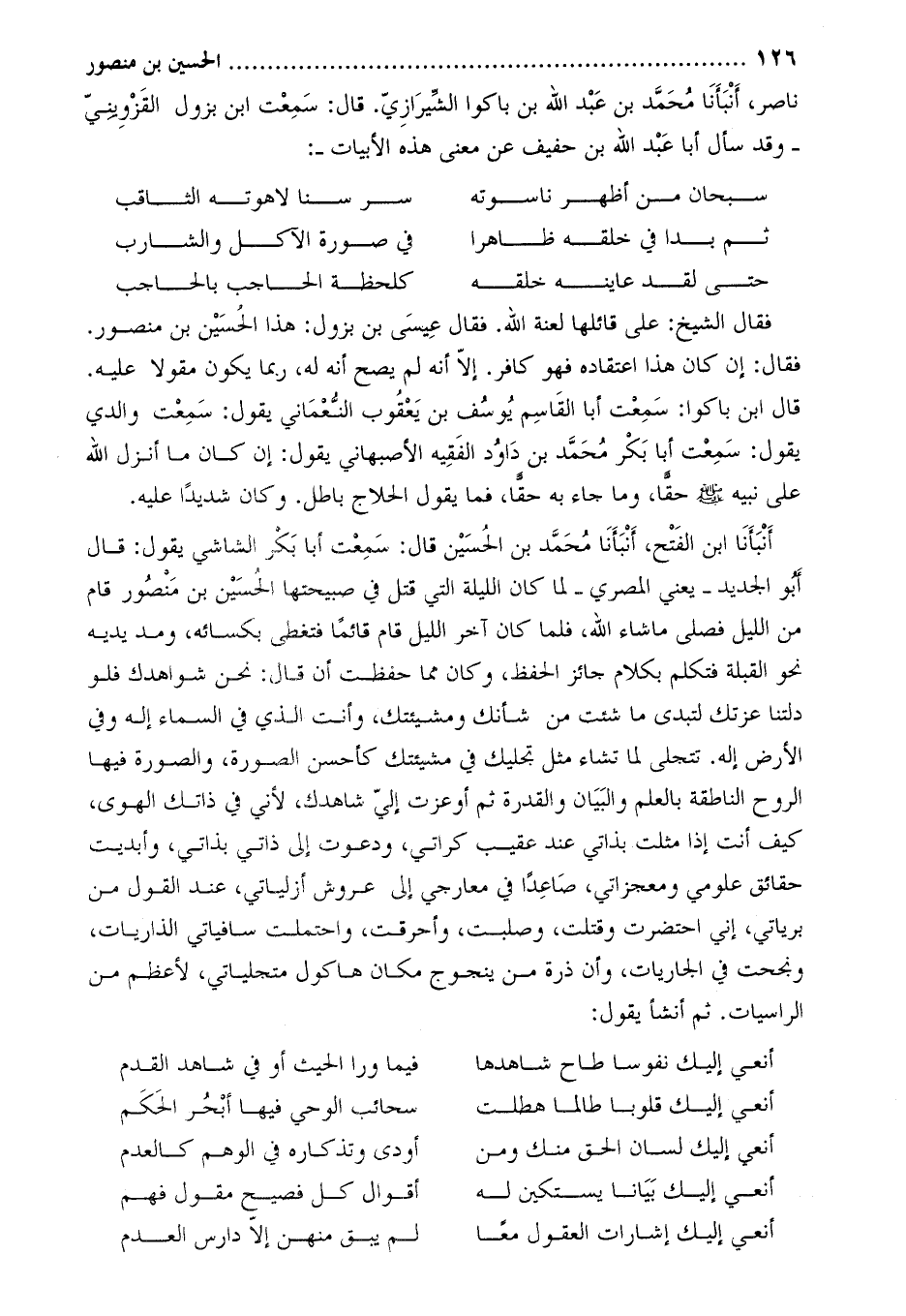 فَقَالَ الشيخ: عَلَى قائلها لعنه اللَّه. فَقَالَ عيسى بن بزول: هذا الحسين بن مَنْصُور.