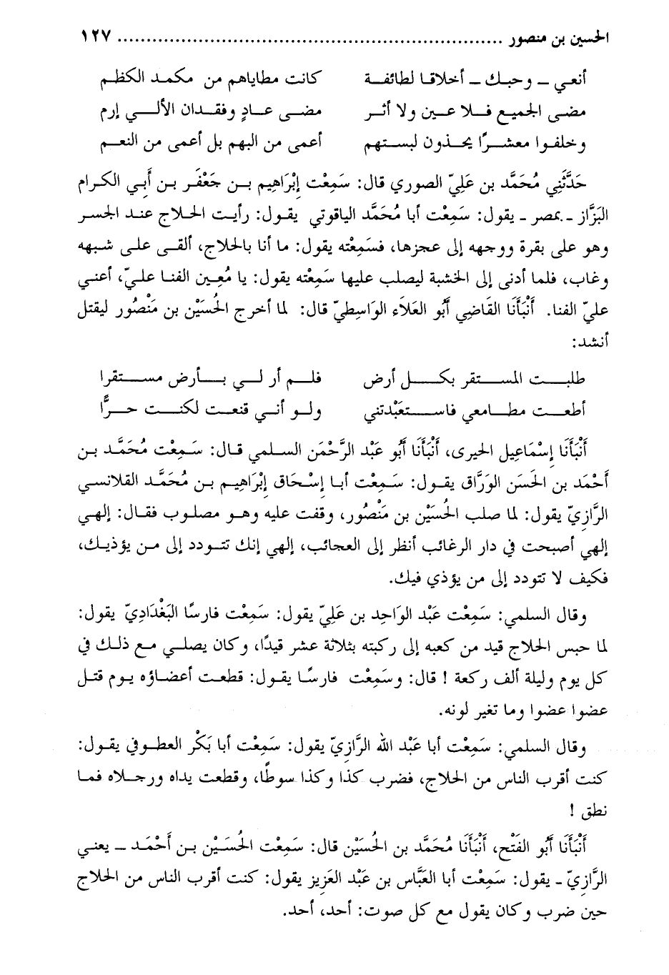 حَدَّثَنِي مُحَمَّد بْن عَلِيّ الصوري قَالَ: سمعت إِبْرَاهِيم بن جَعْفَر بن أَبِي الكرام الْبَزَّاز- بمصر- يَقُولُ: سمعت أبا مُحَمَّد الياقوتي يَقُولُ: رأيت الحلاج عند الجسر وهو عَلَى بقرة ووجهه إلى عجزها، فسمعته يَقُولُ: ما أنا بالحلاج، ألقى عَلَى شبهه وغاب، فلما أدنى إِلَى الخشبة ليصلب عليها سمعته يقول: يا معين الفنا عليّ، أعني عليّ الفنا. أنبأنا الْقَاضِي أَبُو العلاء الواسطي قَالَ: لما أخرج الحسين بن منصور ليقتل أنشد: