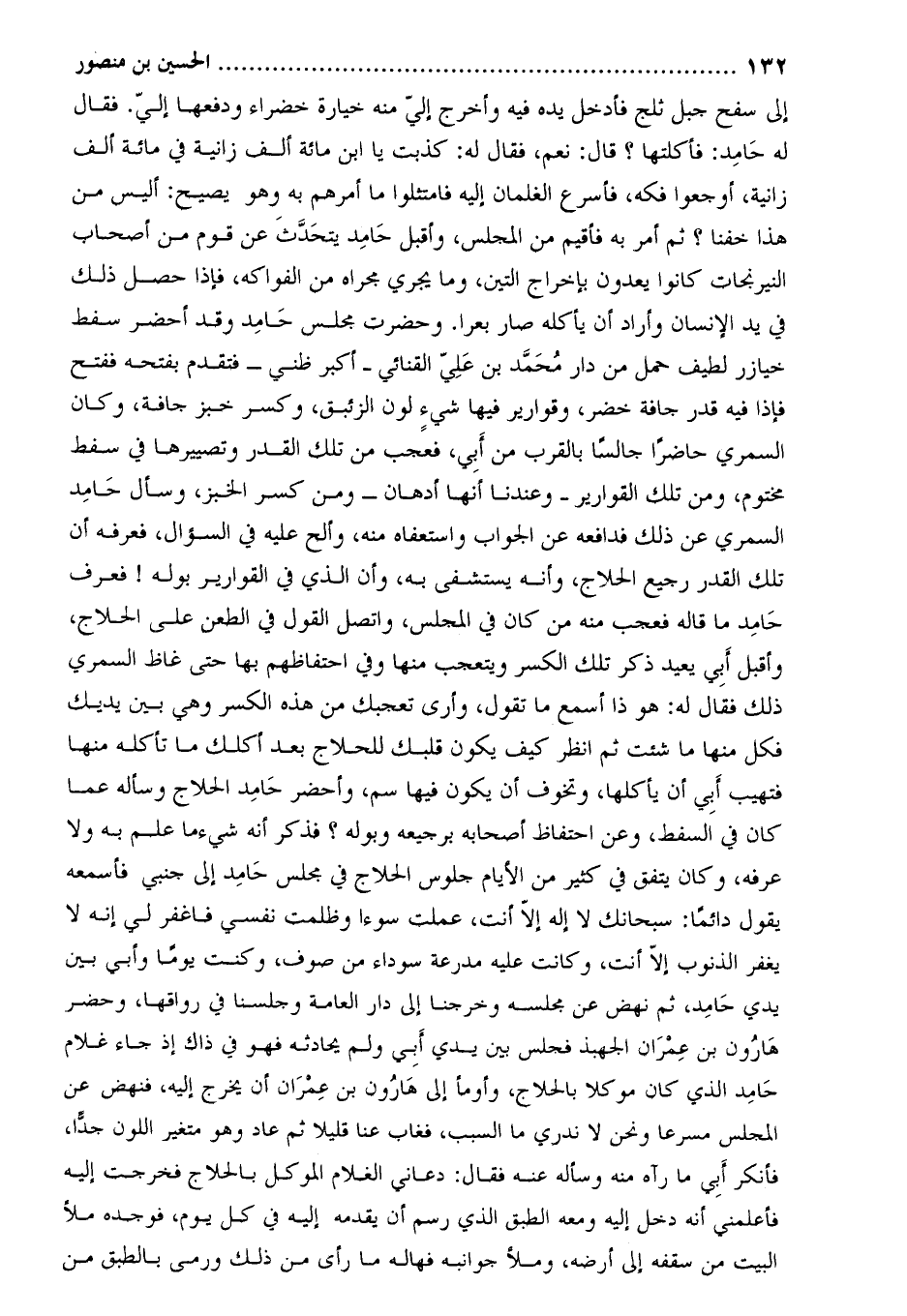 إِلَى سفح جبل ثلج فأدخل يده فيه وأخرج إلي منه خيارة خضراء ودفعها إلي. فَقَالَ لَهُ حامد: فأكلتها؟ قَالَ: نعم، فَقَالَ له: كذبت يا ابن مائة ألف زانية فِي مائة ألف زانية، أوجعوا فكه، فأسرع الغلمان إليه فامتثلوا ما أمرهم به وهو يصيح: أليس من هذا خفنا؟ ثم أمر به فأقيم من المجلس، وأقبل حامد يتحدث عَنْ قوم من أصحاب النيرنجات كانوا يعدون بإخراج التين، وما يجرى مجراه من الفواكه، فإذا حصل ذلك فِي يد الإنسان وأراد أن يأكله صار بعرا. وحضرت مجلس حامد وقد أحضر سفط خيازر لطيف حمل من دار مُحَمَّد بن عَلِيّ القنائي- أكبر ظني- فتقدم بفتحه ففتح فإذا فيه قدر جافة خضر، وقوارير فيها شيء لون الزئبق، وكسر خبز جافة، وكان السمري حاضرا جالسا بالقرب من أَبِي، فعجب من تلك القدر وتصييرها فِي سفط مختوم، ومن تلك القوارير- وعندنا أنها أدهان- ومن كسر الخبز، وسأل حامد السمري عَنْ ذلك فدافعه عَنِ الجواب واستعفاه منه، وألح عليه فِي السؤال، فعرفه أن تلك القدر رجيع الحلاج، وأنه يستشفي به، وأن الذي فِي القوارير بوله! فعرف حامد ما قاله فعجب منه من كَانَ فِي المجلس، واتصل القول فِي الطعن عَلَى الحلاج، وأقبل أَبِي يعيد ذكر تلك الكسر ويتعجب منها وفي احتفاظهم بها حتى غاظ السمري ذلك فَقَالَ لَهُ: هو ذا أسمع ما تقول، وأرى تعجبك من هذه الكسر وهي بين يديك فكل منها ما شئت ثم انظر كيف يكون قلبك للحلاج بعد أكلك ما تأكله منها فتهيب أَبِي أن يأكلها، وتخوف أن يكون فيها سم، وأحضر حامد الحلاج وسأله عما كَانَ فِي السفط، وعن احتفاظ أصحابه برجيعه وبوله؟ فذكر أَنَّهُ شيء ما علم به ولا عرفه، وكان يتفق فِي كثير من الأيام جلوس الحلاج فِي مجلس حامد إِلَى جنبي فأسمعه يَقُولُ دائما: سبحانك لا إله إِلا أنت، عملت سوءا وظلمت نفسي فاغفر لِي إِنَّهُ لا يغفر الذنوب إِلا أنت، وكانت عليه مدرعة سوداء من صوف، وكنت يوما وأبي بين يدي حامد، ثم نهض عَنْ مجلسه وخرجنا إِلَى دار العامة وجلسنا فِي رواقها، وحضر هَارُون بن عمران الجهبذ فجلس بين يدي أَبِي ولم يحادثه فهو فِي ذاك إذ جاء غلام حامد الذي كَانَ موكلا بالحلاج، وأومأ إِلَى هَارُون بن عمران أن يخرج إليه، فنهض عَنِ المجلس مسرعا ونحن لا ندري ما السبب، فغاب عنا قليلا ثم عاد وهو متغير اللون جدا، فأنكر أَبِي ما رآه منه وسأله عنه فَقَالَ: دعاني الغلام الموكل بالحلاج فخرجت إليه فأعلمني أَنَّهُ دخل إليه ومعه الطبق الذي رسم أن يقدمه إليه فِي كل يوم، فوجده ملأ البيت من سقفه إِلَى أرضه، وملأ جوانبه فهاله ما رأى من ذلك ورمى بالطبق من
