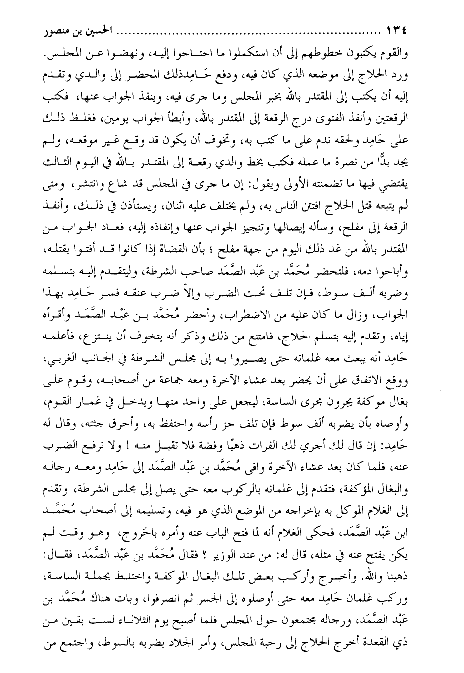 ورد الحلاج إِلَى موضعه الذي كَانَ فيه، ودفع حامد ذلك المحضر إِلَى والدي وتقدم إليه أن يكتب إِلَى المقتدر بالله بخبر المجلس وما جرى فيه، وينفذ الجواب عنها، فكتب الرقعتين وأنفذ الفتوى درج الرقعة إِلَى المقتدر بالله، وأبطأ الجواب يومين، فغلظ ذلك عَلَى حامد ولحقه ندم عَلَى ما كتب به، وتخوف أن يكون قد وقع غير موقعه، ولم يجد بدا من نصرة ما عمله فكتب بخط والدي رقعة إِلَى المقتدر بالله فِي اليوم الثالث يقتضى فيها ما تضمنته الأولى ويقول: إن ما جرى فِي المجلس قد شاع وانتشر، ومتى لم يتبعه قتل الحلاج افتتن الناس به، ولم يختلف عليه اثنان، ويستأذن فِي ذلك، وأنفذ الرقعة إلى مفلح، وسأله إيصالها وتنجيز الجواب عنها وإنفاذه إليه، فعاد الجواب من المقتدر بالله من غد ذلك اليوم من جهة مفلح؛ بأن القضاة إذا كانوا قد أفتوا بقتله، وأباحوا دمه، فلتحضر مُحَمَّد بن عبد الصمد صاحب الشرطة، وليتقدم إليه بتسلمه وضربه ألف سوط، فإن تلف تحت الضرب وإلا ضرب عنقه فسر حامد بهذا الجواب، وزال ما كَانَ عليه من الإضطراب، وأحضر مُحَمَّد بن عبد الصمد وأقرأه إياه، وتقدم إليه بتسلم الحلاج، فامتنع من ذلك وذكر أَنَّهُ يتخوف أن ينتزع، فأعلمه حامد أَنَّهُ يبعث معه غلمانه حتى يصيروا به إِلَى مجلس الشرطة فِي الجانب الغربي، ووقع الاتفاق عَلَى أن يحضر بعد عشاء الآخرة ومعه جماعة من أصحابه، وقوم على بغال موكفة يجرون مجرى الساسة، ليجعل عَلَى واحد منها ويدخل فِي غمار القوم، وأوصاه بأن يضربه ألف سوط فإن تلف حز رأسه واحتفظ به، وأحرق جثته، وَقَالَ لَهُ حامد: إن قَالَ لك أجري لك الفرات ذهبا وفضة فَلا تقبل منه! ولا ترفع الضرب عنه، فلما كَانَ بعد عشاء الآخرة وافى مُحَمَّد بن عبد الصمد إِلَى حامد ومعه رجاله والبغال المؤكفة، فتقدم إِلَى غلمانه بالركوب معه حتى يصل إِلَى مجلس الشرطة، وتقدم إِلَى الغلام الموكل به بإخراجه من الموضع الذي هو فيه، وتسليمه إلى أصحاب محمّد ابن عبد الصمد، فحكى الغلام أَنَّهُ لما فتح الباب عنه وأمره بالخروج، وهو وقت لم يكن يفتح عنه فِي مثله، قَالَ لَهُ: من عند الوزير؟ فَقَالَ مُحَمَّد بن عبد الصمد، فَقَالَ: