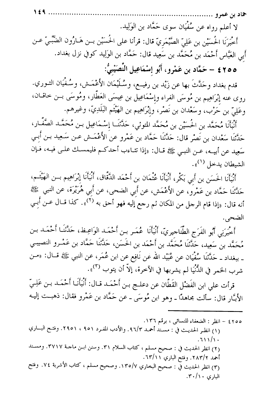 أَخْبَرَنِي أَبُو الْفَرَجِ الطّناجيريّ، أنبأنا عمر بن أحمد الواعظ، حدّثنا أحمد بن محمّد بن سعيد، حَدَّثَنَا مُحَمَّدُ بْنُ أَحْمَدَ بْنِ الْحَسَنِ، حَدَّثَنَا حمّاد بن عمرو النصيبي- ببغداد- حَدَّثَنَا سُفْيَانُ عَنْ عُبَيْدِ اللَّهِ عَنْ نَافِعٍ عَنِ ابْنِ عُمَرَ، عَنِ النَّبِيِّ صَلَّى اللَّهُ عَلَيْهِ وَسَلَّمَ قَالَ: «مَنْ شَرِبَ الْخَمْرَ فِي الدُّنْيَا لَمْ يَشْرَبْهَا فِي الآخِرَةِ، إِلا أَنْ يَتُوبَ [4] »