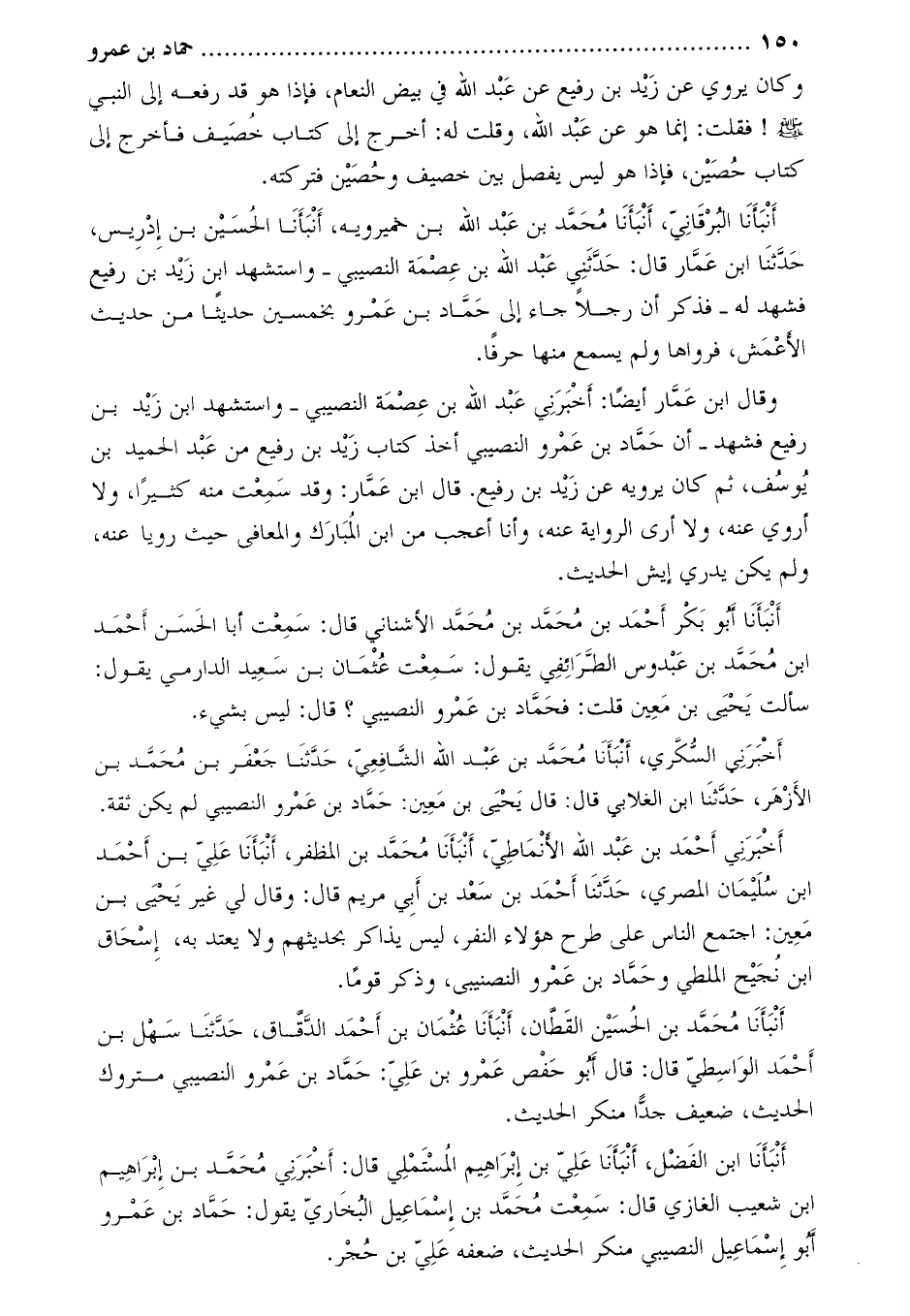 وَقَالَ ابْن عمار أَيْضًا: أَخْبَرَنِي عبد الله بن عصمة النصيبي- وَاستشهد ابْن زيد بْن رفيع فشهد- أن حَمَّاد بْن عَمْرو النصيبي أخذ كتاب زيد بْن رفيع من عَبْد الحميد بْن يوسف، ثُمَّ كَانَ يرويه عَنْ زيد بْن رفيع. قَالَ ابْن عمار: وَقد سمعت منه كثيرا، وَلا أروي عنه، وَلا أرى الرواية عنه، وَأنا أعجب من ابْن المبارك وَالمعافى حيث رويا عنه، وَلم يكن يدري أيش الحديث.