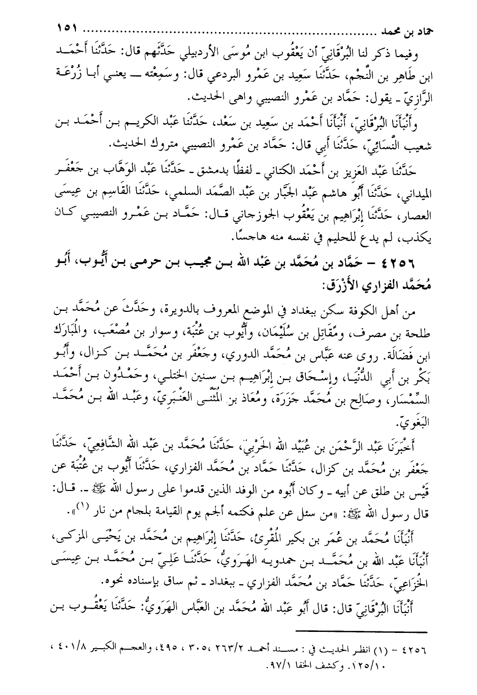 4256- حَمَّاد بْن مُحَمَّد بْن عَبْد اللَّهِ بْن مجيب بْن حرمي بْن أيوب، أَبُو مُحَمَّد الفزاري الأزرق: