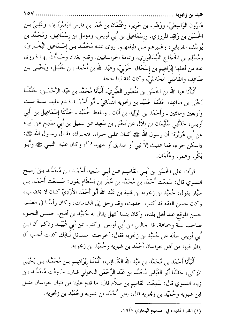 قرأت على الْحَسَن بْن أَبِي الْقَاسِم عَنْ أَبِي سَعِيد أَحْمَد بْن مُحَمَّد بْن رميح النسوي قَالَ: سَمِعْتُ أَحْمَد بْن مُحَمَّد بْن عُمَر بْن بسطام يَقُولُ: سَمِعْتُ أَحْمَد بْن سيار يقول: حميد بْن زنجويه بْن قتيبة بْن عَبْد اللَّهِ أَبُو أَحْمَد الأزدي كَانَ لا يخضب، وَكَانَ حسن الفقه قد كتب الحديث، وَقد رحل إِلَى الشامات، وَكَانَ رأسا فِي العلم.