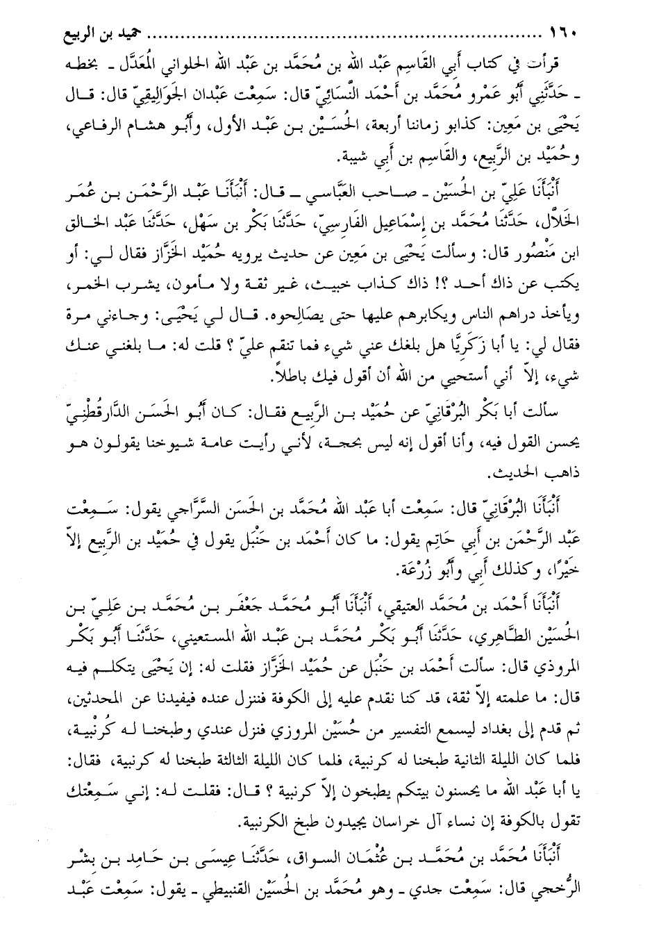 أنبأنا البرقاني قَالَ: سمعت أبا عَبْد اللَّهِ مُحَمَّد بْن الْحَسَن السراجي يقول: سمعت عَبْد الرَّحْمَنِ بْن أَبِي حاتم يقول: ما كَانَ أَحْمَد بْن حَنْبَل يقول فِي حميد بْن الربيع إلّا خيرا، وكذلك أبي وأبو زرعة.
