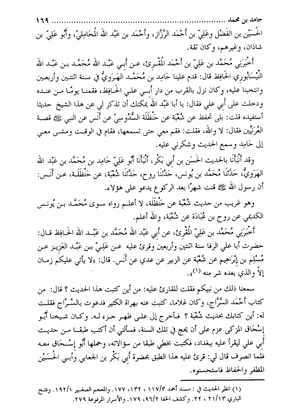 أَخْبَرَنِي مُحَمَّدُ بْنُ عَلِيِّ بْنِ أَحْمَدَ الْمُقْرِئُ، عَن أَبِي عَبْد اللَّه مُحَمَّد بْن عَبْدِ اللَّهِ النَّيْسَابُورِيِّ الْحَافِظِ قَالَ: قَدِمَ عَلَيْنَا حَامِدُ بْنُ مُحَمَّدٍ الْهَرَوِيُّ فِي سَنَةِ اثْنَتَيْنِ وَأَرْبَعِينَ وَانْتَخَبْنَا عَلَيْهِ، وكان نزل بالقرب من دار أبي عَلِيٍّ الْحَافِظِ، فَقُمْنَا يَوْمًا مِنْ عِنْدِهِ وَدَخَلْتُ عَلَى أَبِي عَلِيٍّ فَقَالَ: يَا أَبَا عَبْدِ اللَّهِ يُمْكِنُكَ أَنْ تَذْكُرَ لِي عَنْ هَذَا الشَّيْخِ حَدِيثًا أَسْتَفِيدُهُ قُلْتُ: بَلَى تَحْفَظُ عَنْ شُعْبَةَ عَنْ حَنْظَلَةَ السَّدُوسِيِّ عَنْ أَنَسٍ عَنِ النَّبِيِّ صَلَّى اللَّهُ عَلَيْهِ وَسَلَّمَ قِصَّةَ الْعُرَنِيِّينَ فَقَالَ: لا وَاللَّهِ، فَقُلْتُ: فَقُمْ مَعِي حَتَّى تَسْمَعَهَا، فَقَامَ فِي الْوَقْتِ وَمَشَى مَعِي إِلَى حامد وسمع الحديث وشكرني عليه.