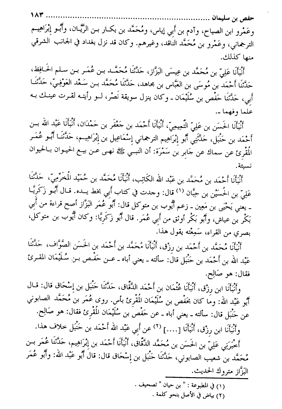 أَنْبَأَنَا عَلِيّ بْن مُحَمَّدِ بْنِ عِيسَى البَزَّاز، حَدَّثَنَا محمد بن عمر بن سلم الحافظ، حَدَّثَنَا أَحْمَدُ بْنُ مُوسَى بْنِ الْعَبَّاسِ بْنِ مُجَاهِدٍ، حدّثنا محمّد بن سعد العوفيّ، حدّثنا أبي، حَدَّثَنَا حفص بْن سُلَيْمَان- وَكَانَ ينزل سويقة نصر، لو رأيته لقرت عينك به علما وفهما-.